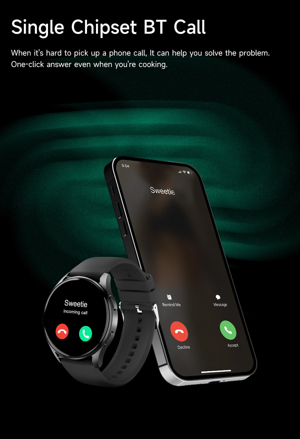 Single Chipset BT Calling: Answer calls with one tap directly from your watch—perfect when cooking, driving, or your hands are full.