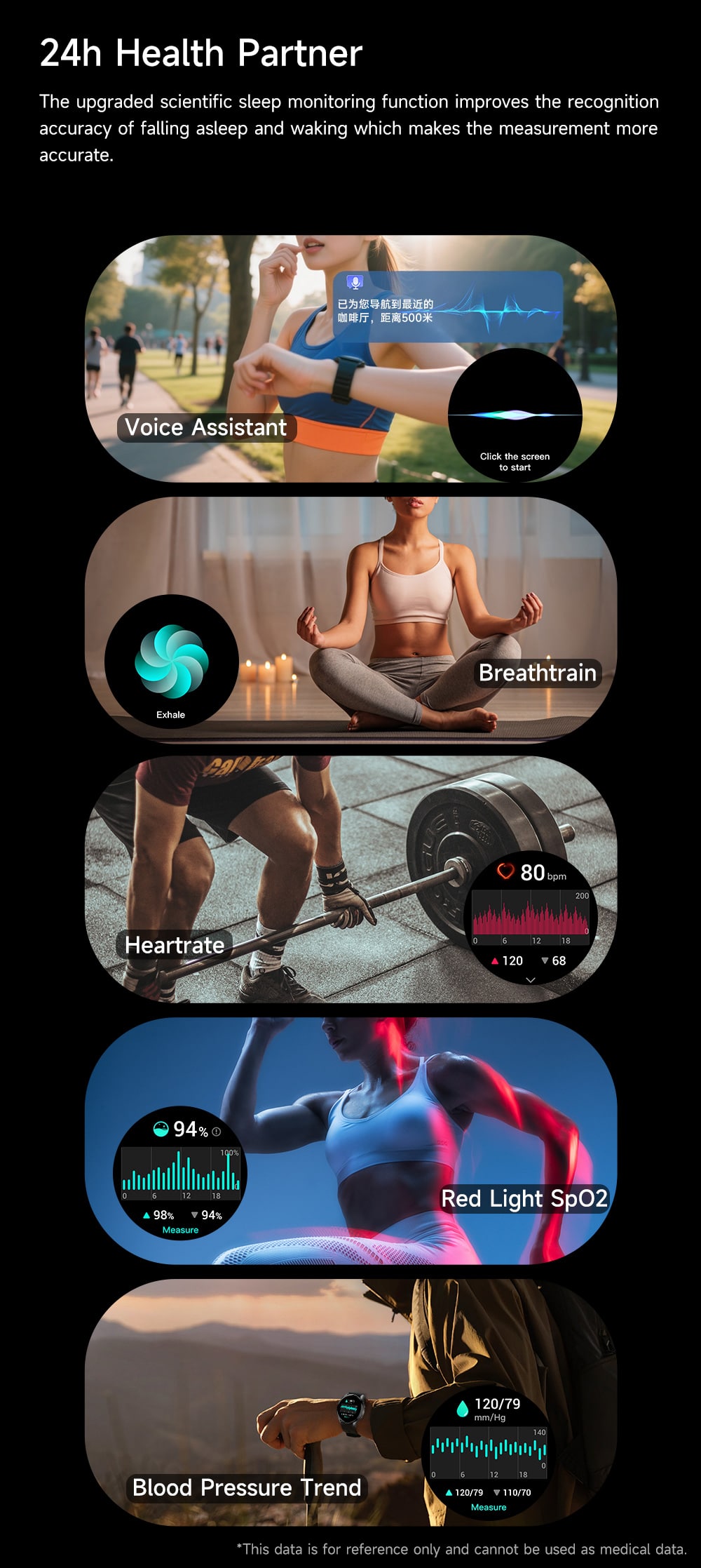 Practical Tools: World clock, calculator, breath training guide, sedentary reminders, and weather updates.
