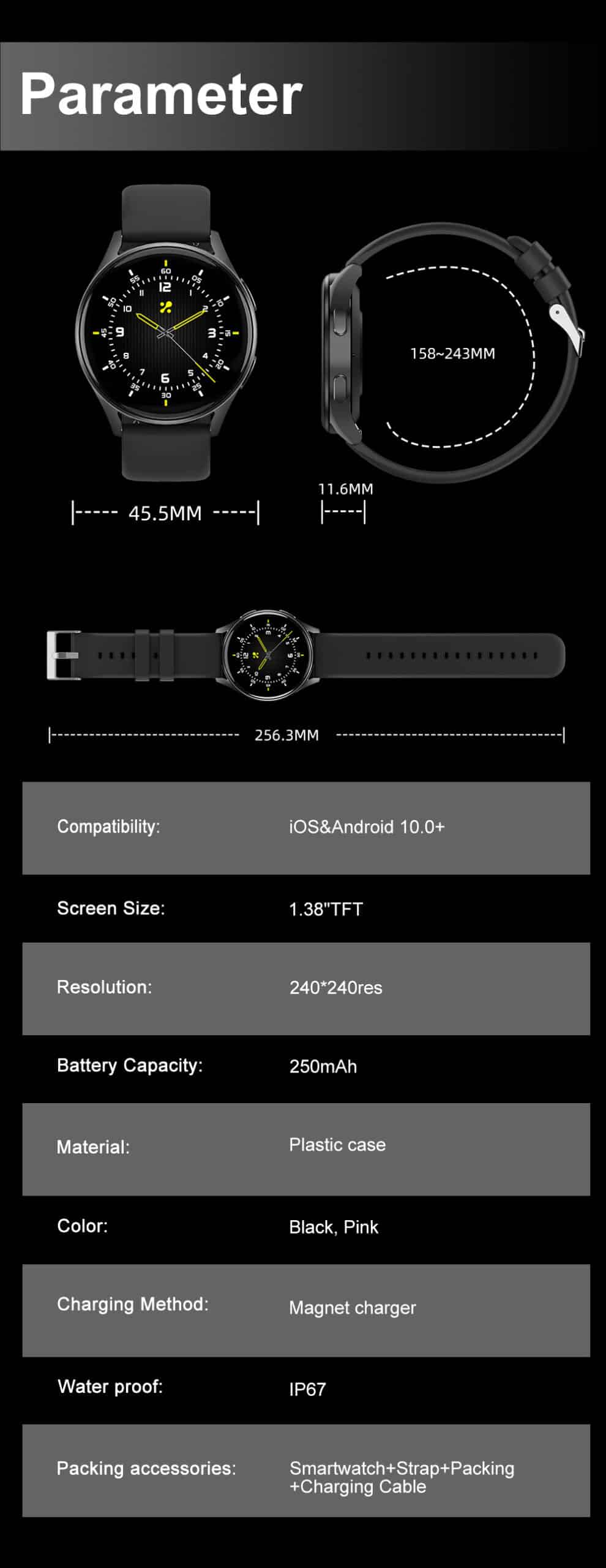 | Strap Size | Fits 155mm – 243mm wrists |