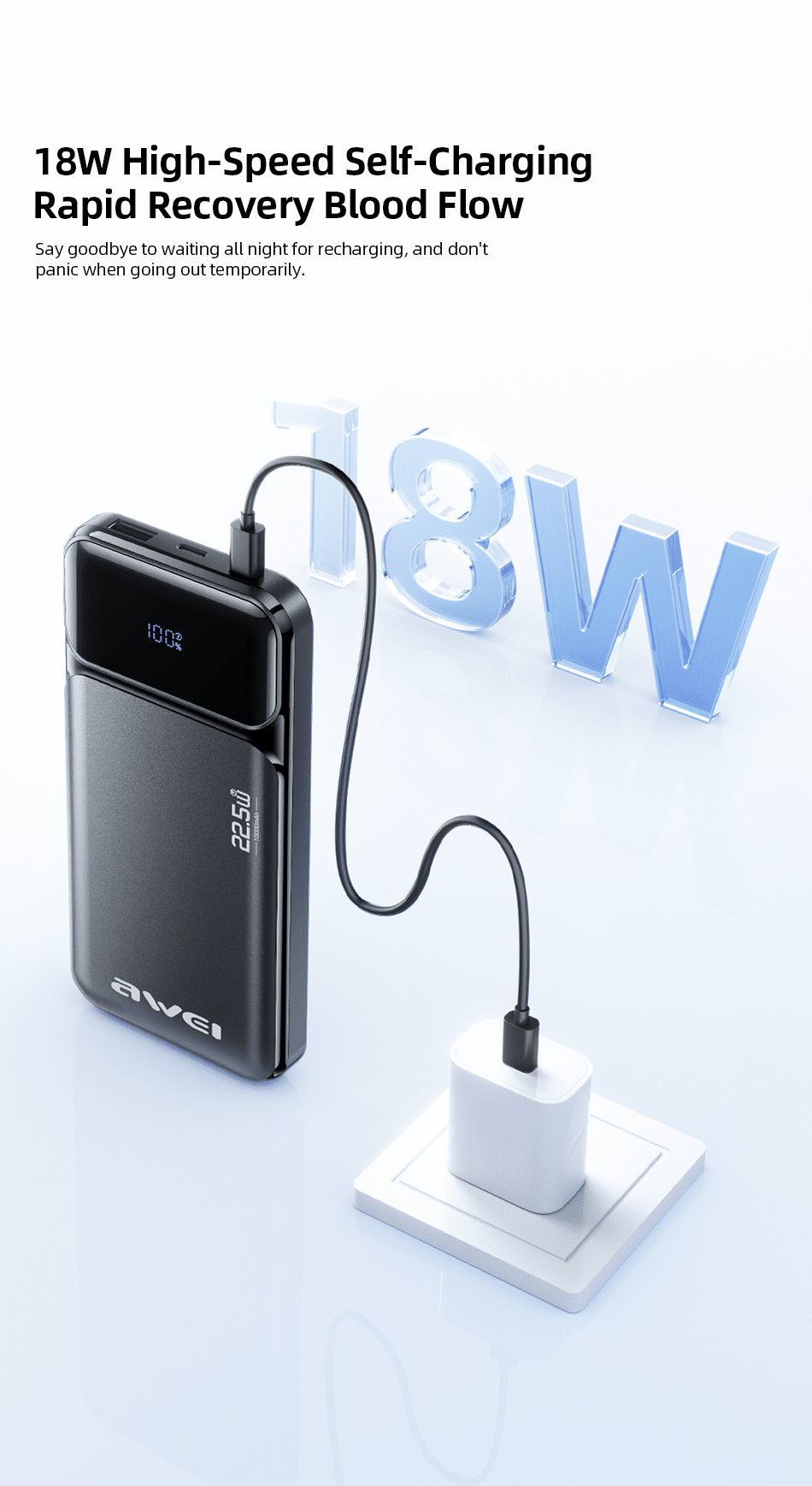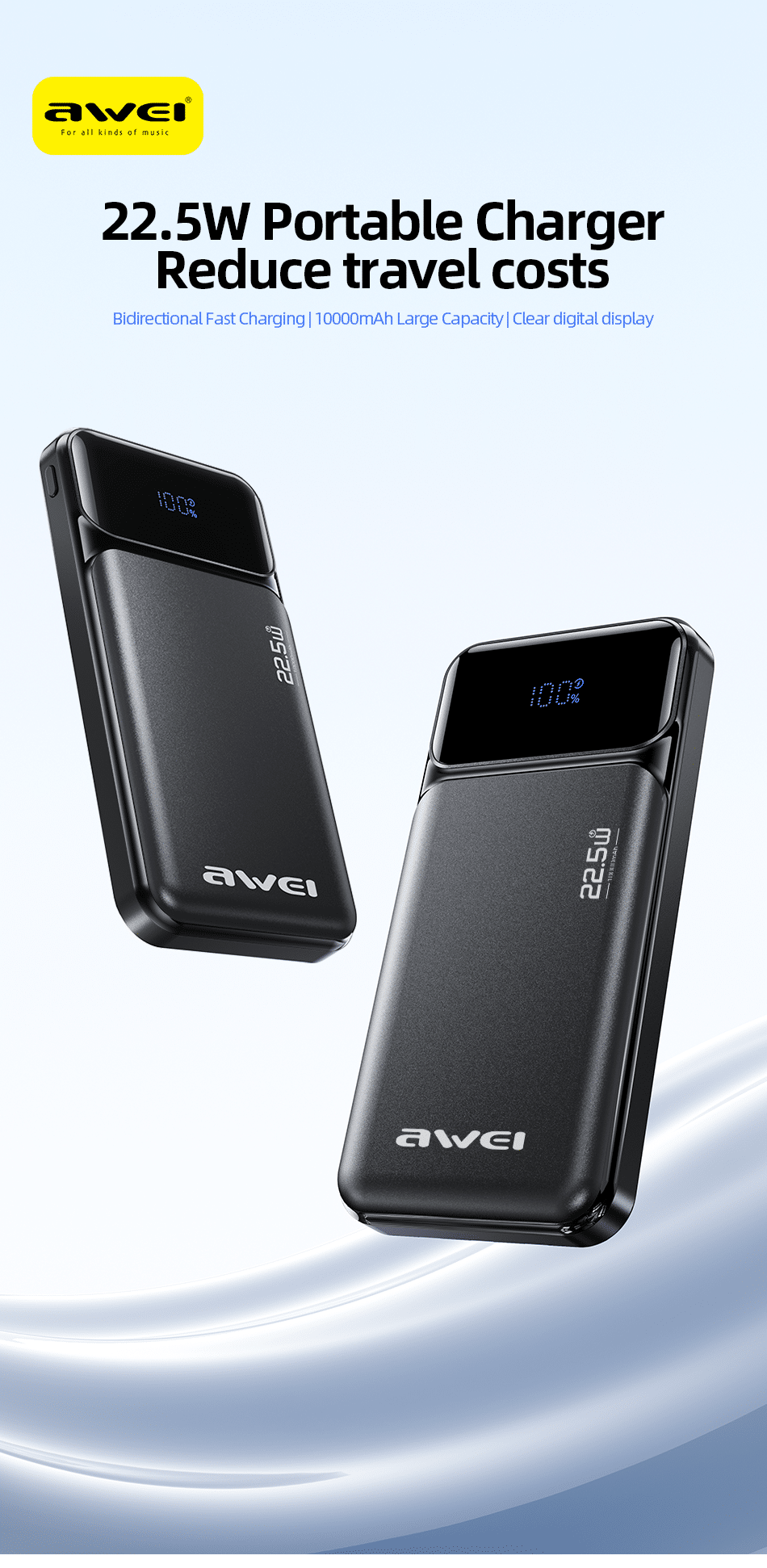 Awei PA‑90 22.5W Fast Power Bank 10000mAh: Digital Display | Dual Ports | PD + QC Fast Charging
