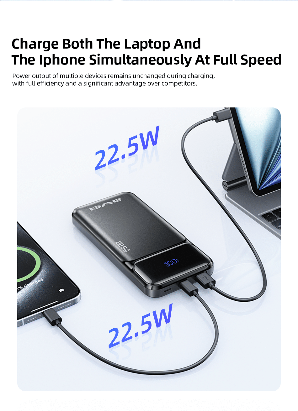 The Awei PA‑90 is equipped with advanced 22.5W fast‑charging technology. Compatible with PD (Power Delivery) for iPhones and USB‑C devices, as well as QC (Quick Charge) for Android smartphones, this power bank delivers significantly faster charging speeds than standard 5W or 10W power banks. Get your devices back to full power quickly – whether you’re at the airport, in a café, or on a long commute.