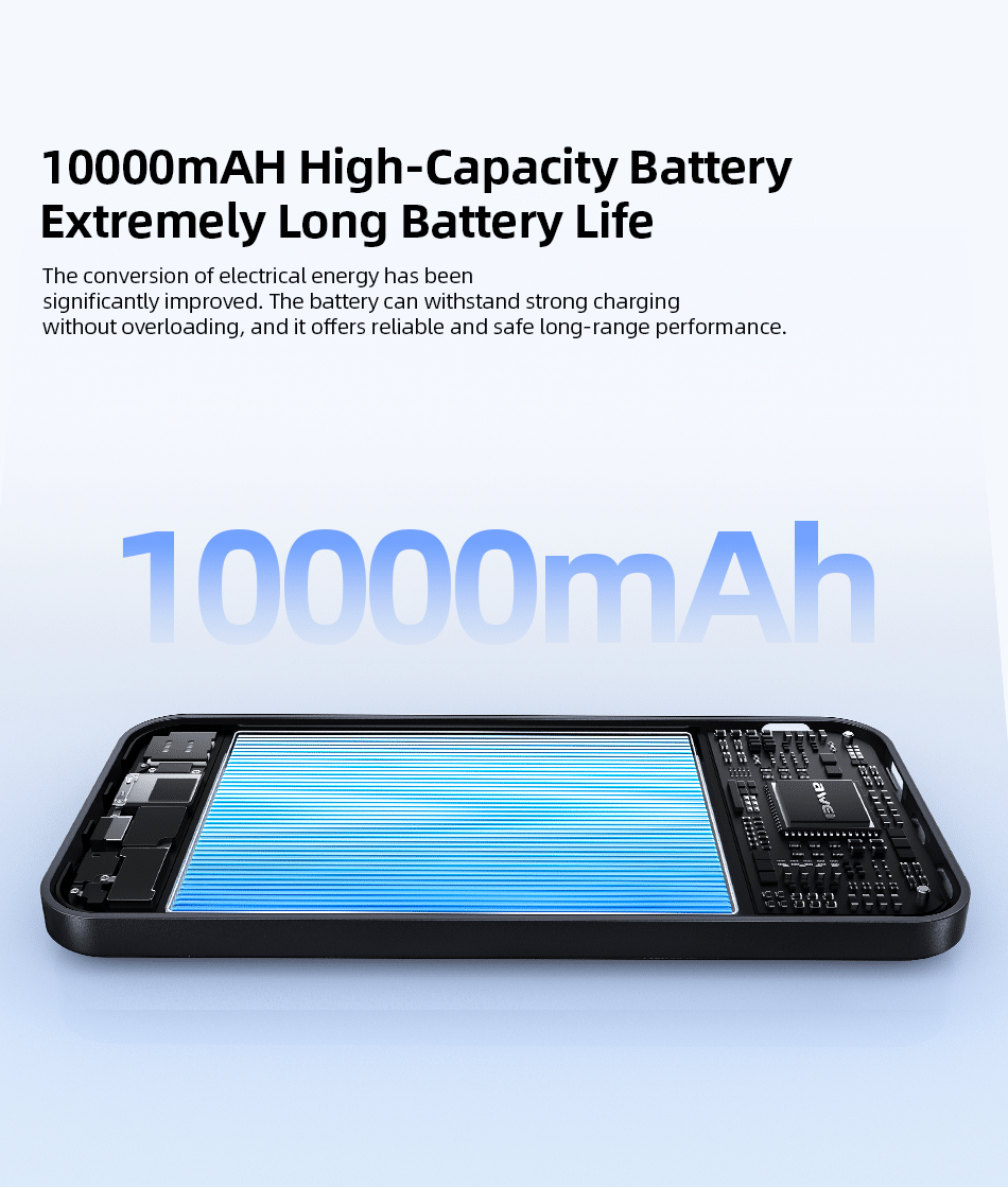 10000mAh High‑Capacity Battery: High‑density lithium polymer battery provides sufficient energy to charge most smartphones multiple times – ideal for everyday power backup, travel, and commuting.