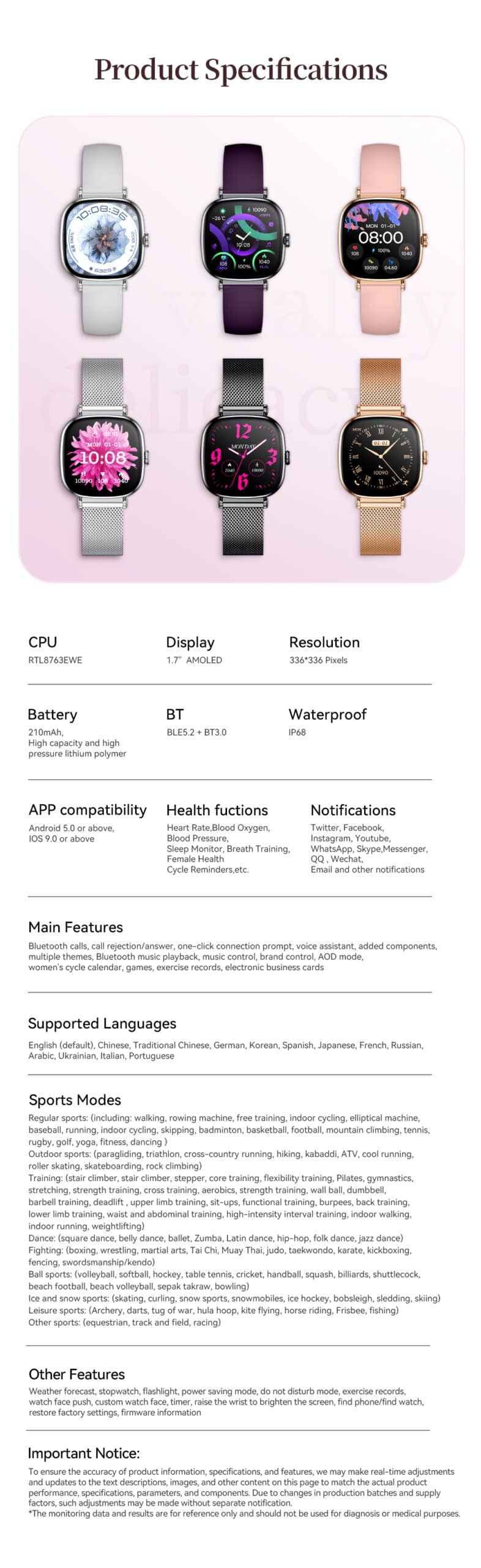 The health monitoring data and results are for reference only and should not be used for medical diagnosis or treatment purposes. Product specifications may be updated to match actual performance and components.