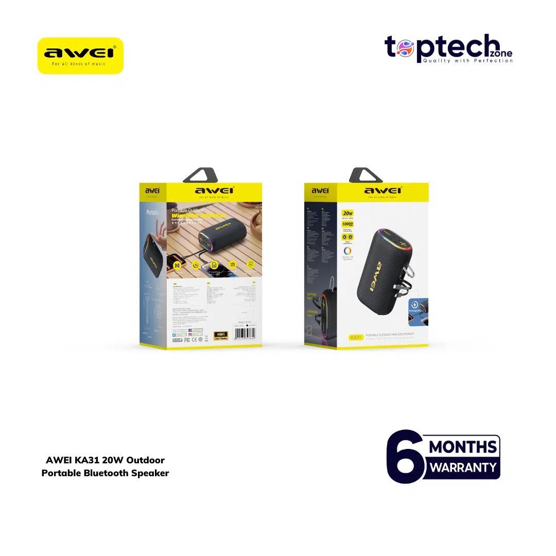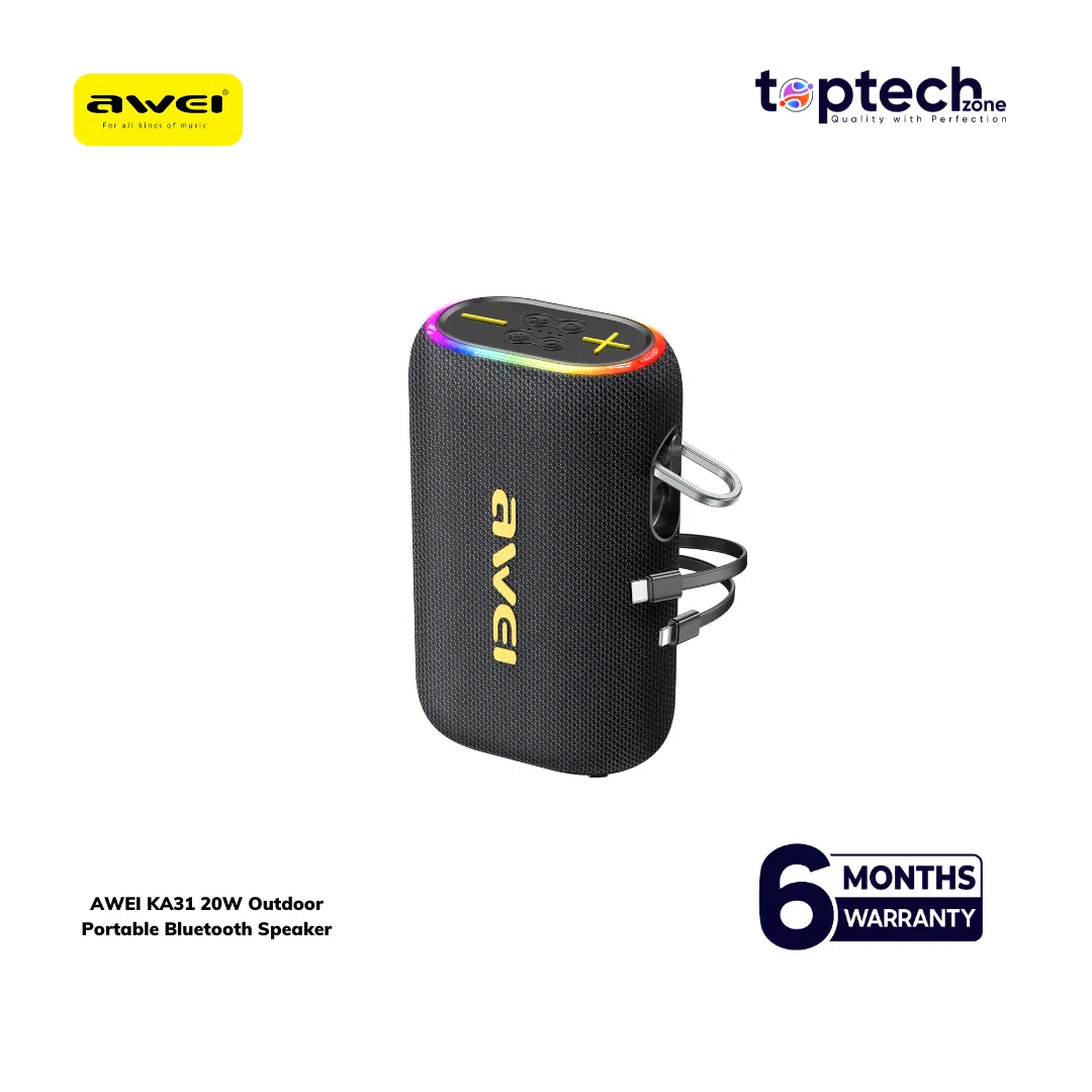 Bring your favorite music anywhere with the AWEI KA31 Outdoor Portable Bluetooth Speaker. Engineered for music lovers who enjoy all kinds of genres, this compact yet powerful speaker delivers 20W of rich, room-filling sound. Whether you’re relaxing at home, hosting a backyard gathering, or heading outdoors, the KA31 combines portable convenience with dynamic RGB lighting to elevate your listening experience. With a built-in 1000mAh battery for extended playtime and Bluetooth connectivity for wireless streaming, it’s the perfect audio companion for any adventure. Top Tech Zone guarantees 100% authentic products backed by an official warranty.