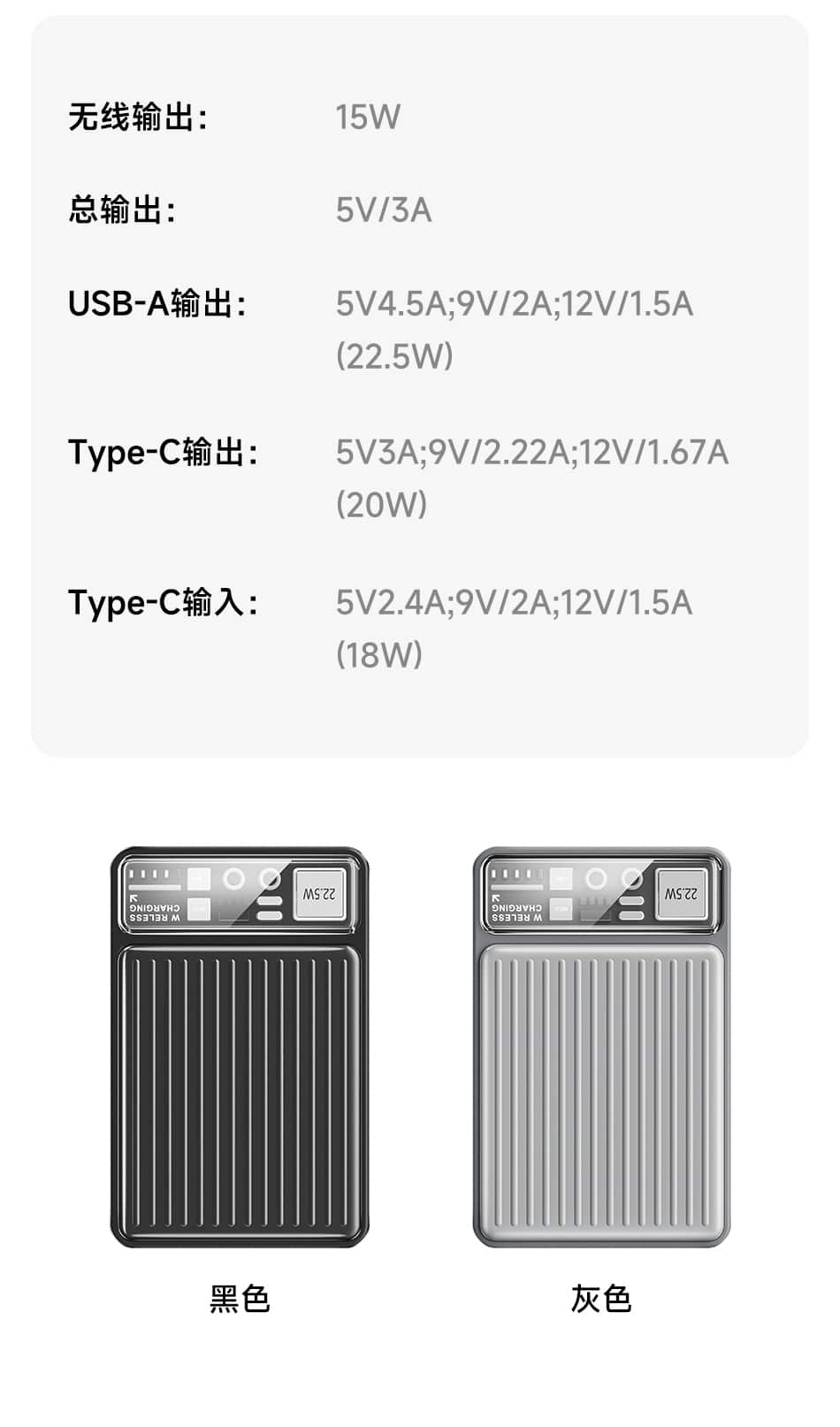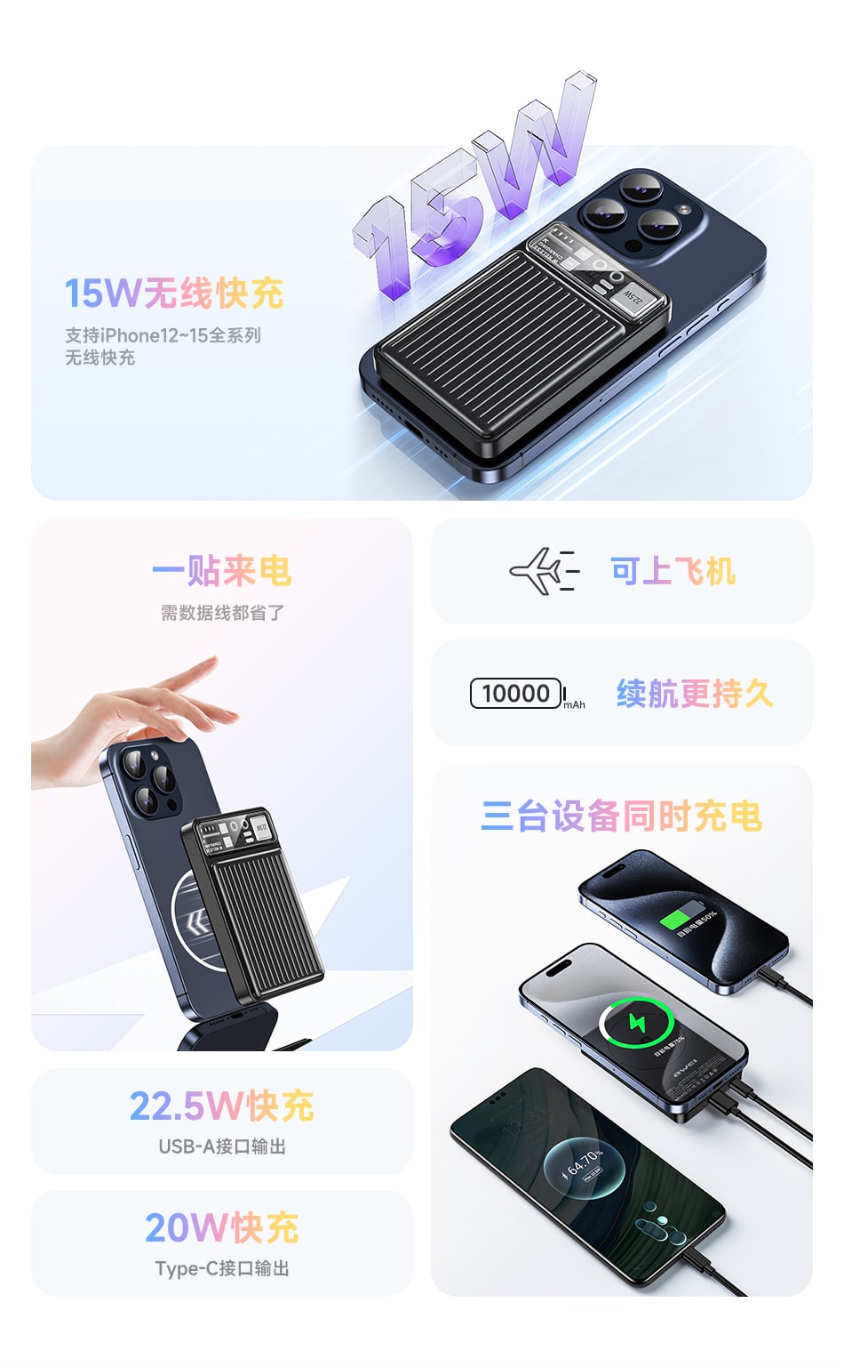 Long-Lasting Power: The 10000mAh polymer battery provides multiple full charges for your phone (e.g., ~2.3 times for iPhone 15 Pro, ~2 times for Huawei Mate 60 Pro).