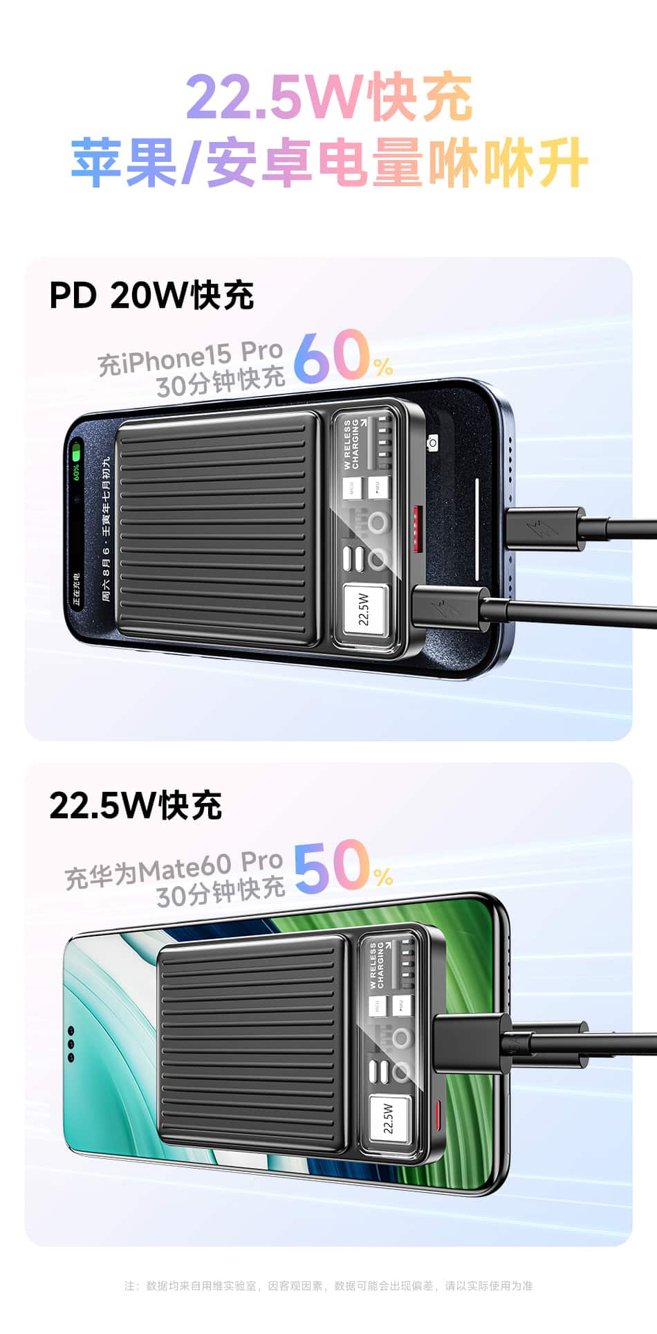 22.5W Super Fast Charging via USB-A: Quickly charge compatible Android phones like the Huawei Mate 60 Pro (approx. 50% in 30 minutes).