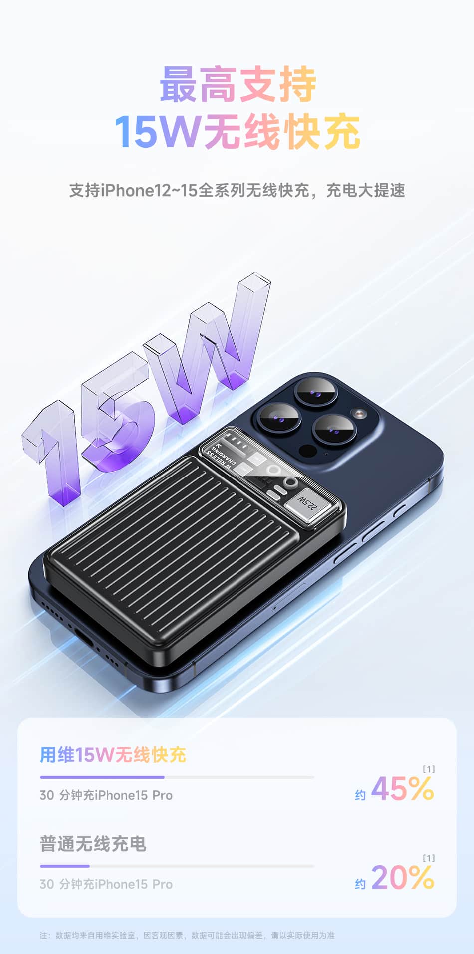 Fast Wireless Performance: Lab tests show it can charge an iPhone 15 Pro to approximately 45% in 30 minutes, significantly faster than standard wireless charging.