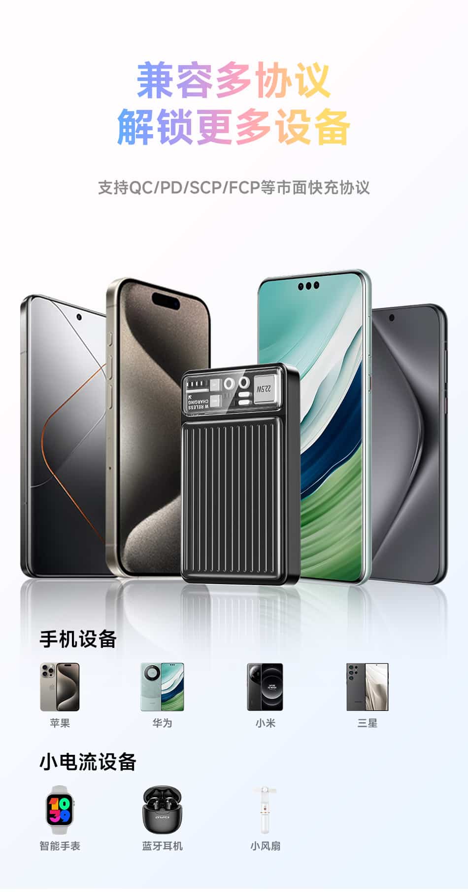 Extensive Device Compatibility: Works with iPhone series, Samsung, Huawei, Xiaomi, Android phones/tablets, smartwatches, Bluetooth earphones, and other low-current devices.