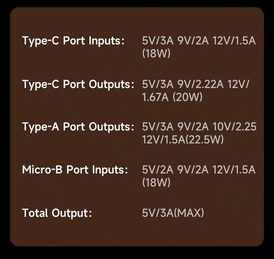 Type-A Port Outputs: 5V/3A 9V/2A 10V/2.25