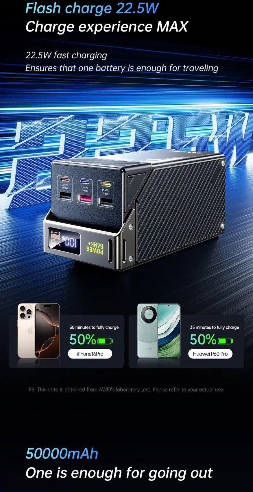 Stay powered anytime, anywhere with Awei PA33 High-performance 50000mAh Power Bank! Designed for ultimate convenience,