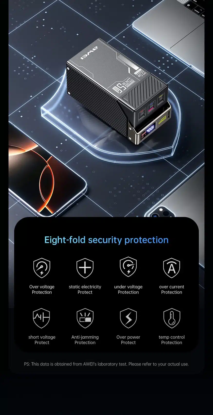 Multi-Port Compatibility – Features 3 Type-C and 3 USB-A ports to charge multiple devices simultaneously.