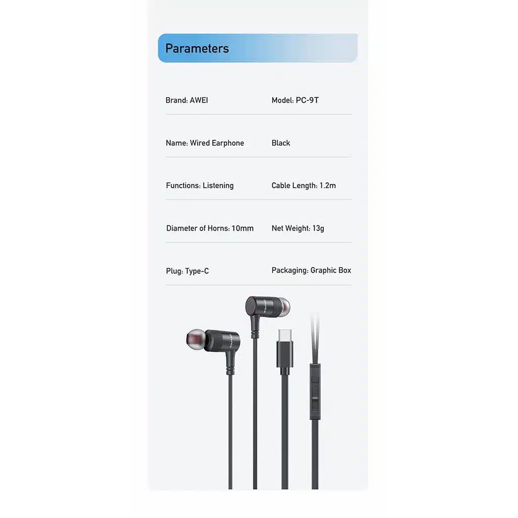 AWEI PC-9T Type-C Wired Earphones: HD Microphone & 10mm Driver for Immersive Sound