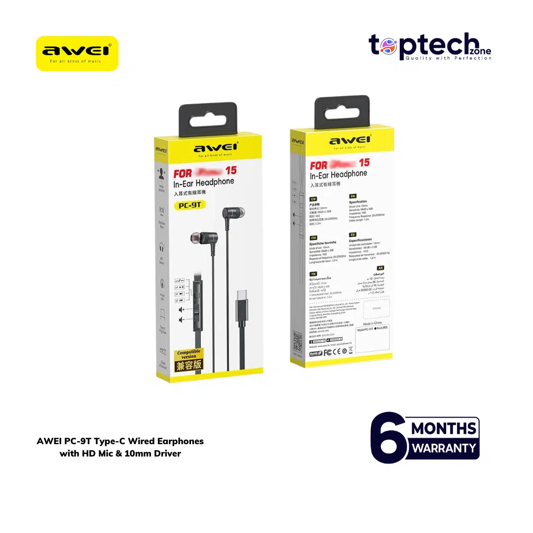 Experience pure, angelic sound with the AWEI PC-9T Type-C Wired Earphones. Designed for those who appreciate the reliability and zero-latency performance of wired audio, these lightweight in-ear headphones deliver stunning sound quality with deep bass and crystal-clear highs. Featuring a hypersensitive HD microphone for smooth communication, an ergonomic semi-in-ear design crafted from over 10,000 fit tests, and a convenient Type-C plug, they’re the perfect companion for music, gaming, calls, and daily listening. Top Tech Zone guarantees 100% authentic products backed by an official warranty.