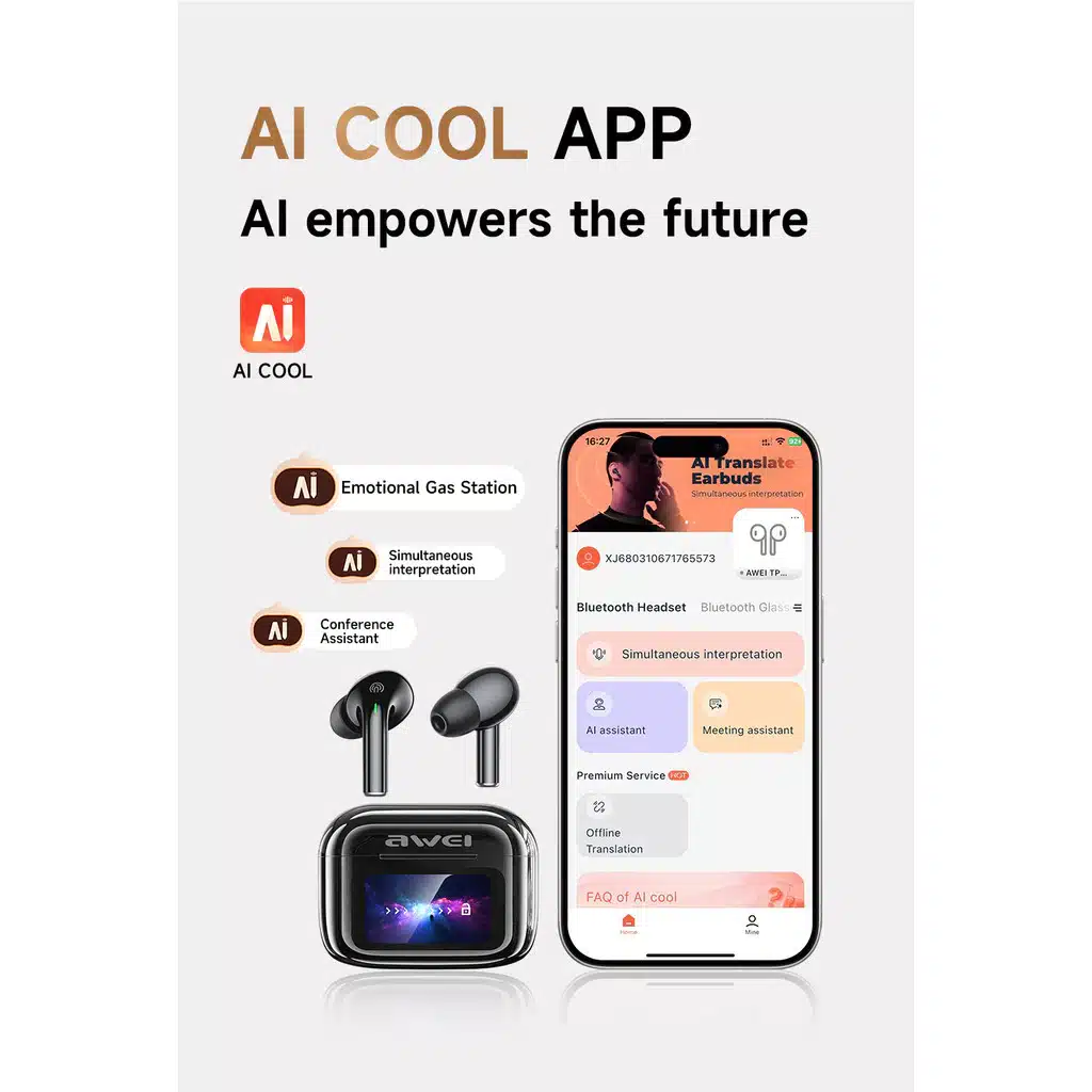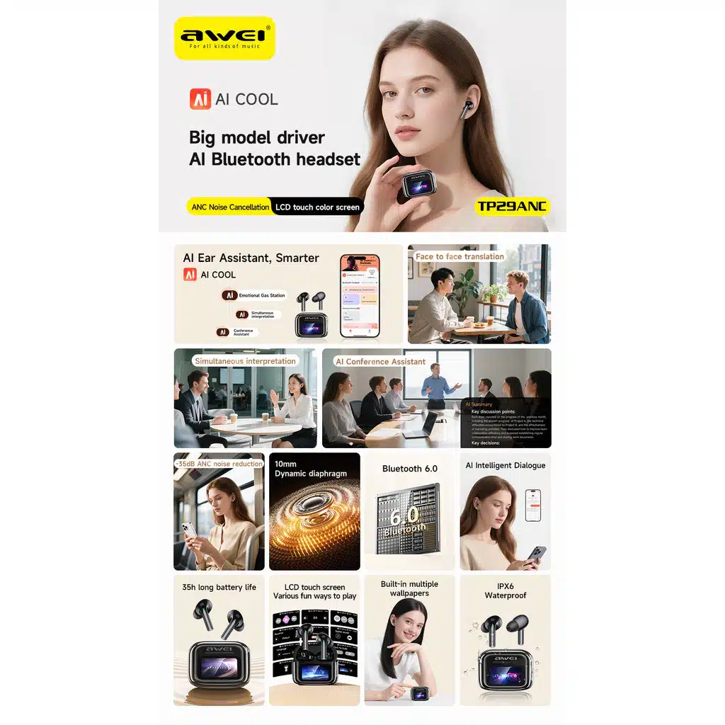 Step into the future of audio and communication with the Awei TP29ANC AI Bluetooth Headset. This isn’t just a pair of earbuds; it’s your personal AI ear assistant, simultaneous interpreter, and noise-canceling powerhouse—all in one sleek device. Powered by a large AI model (iFlytek Spark), it breaks down language barriers with support for 147 languages, acts as your on-call conversational partner, and delivers immersive sound with -35dB Active Noise Cancellation. Featuring a unique LCD touch screen and marathon 35-hour battery life, the TP29ANC redefines what wireless earbuds can do.
