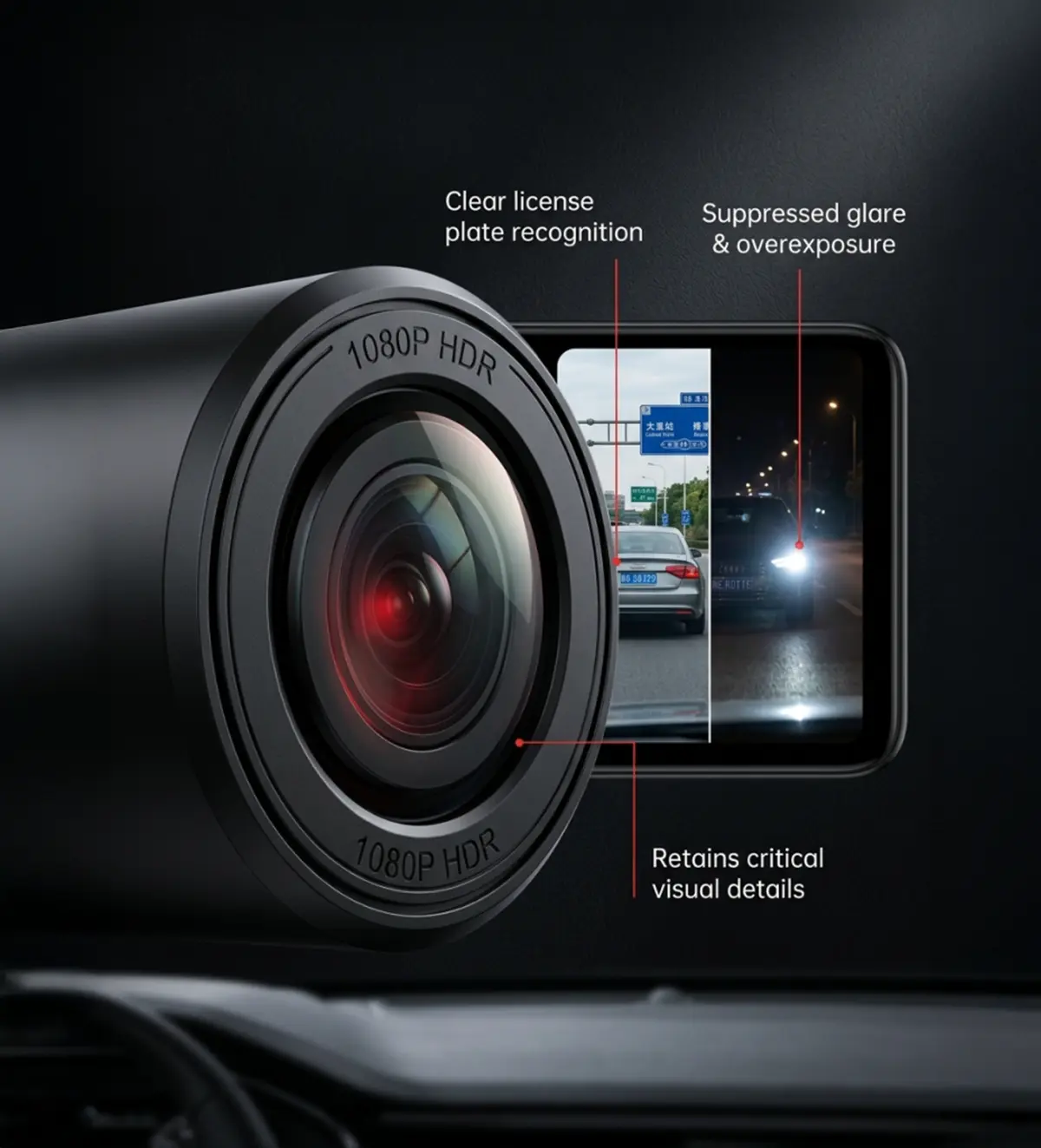 1080P HDR Clear Recording – Day & Night: High‑definition 1920×1080P recording at 25fps with HDR (High Dynamic Range). Retains critical visual details in challenging lighting – bright sunlight, tunnels, low light, and night driving. Suppressed glare and overexposure protection ensure license plates and road signs remain readable.