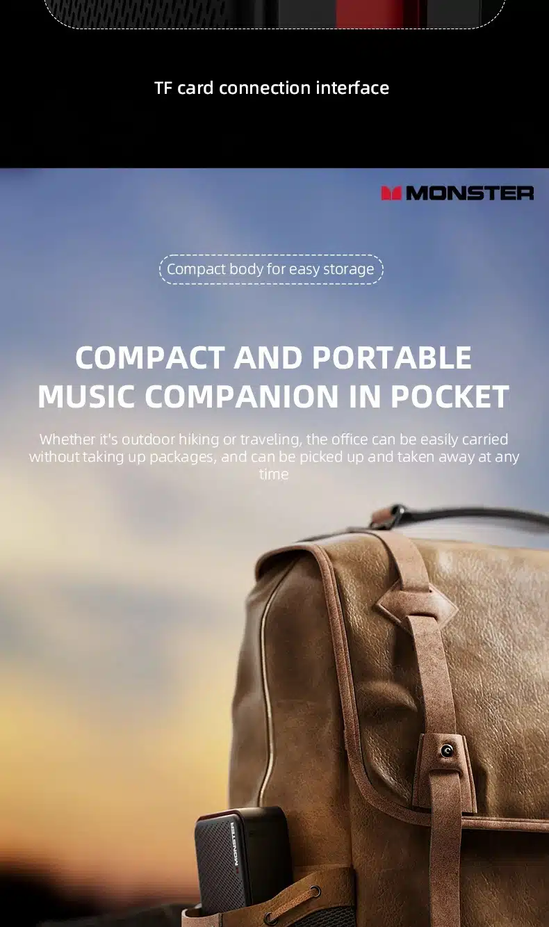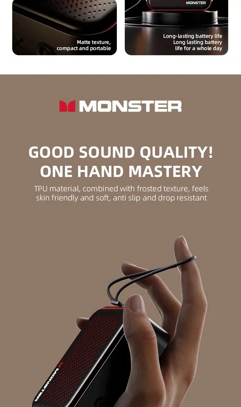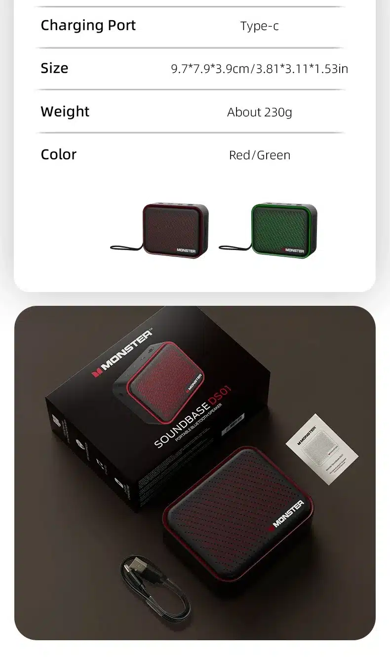 Unleash your music universe with the Monster Soundbase DS01 portable speaker. Engineered for those who refuse to compromise on sound quality or convenience, this compact powerhouse combines 10W high-power output with advanced dual DSP technology. Whether you’re outdoors, traveling, or relaxing at home, the DS01 delivers rich, balanced audio that defies its small size. With IP67 waterproof rating and multiple connectivity options, it’s the perfect companion for every adventure.
