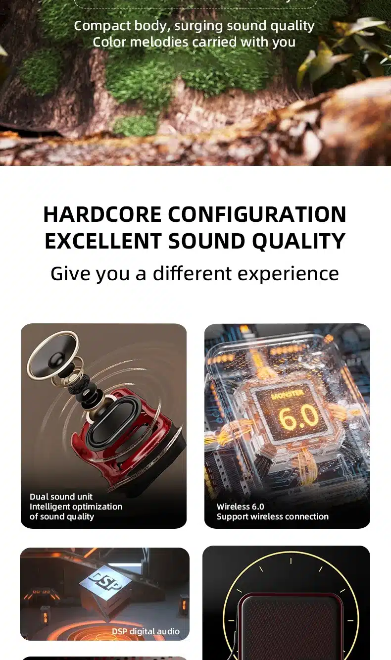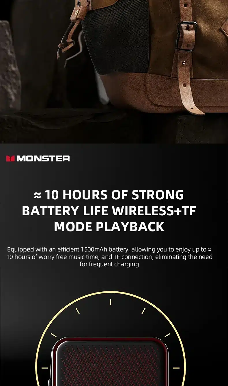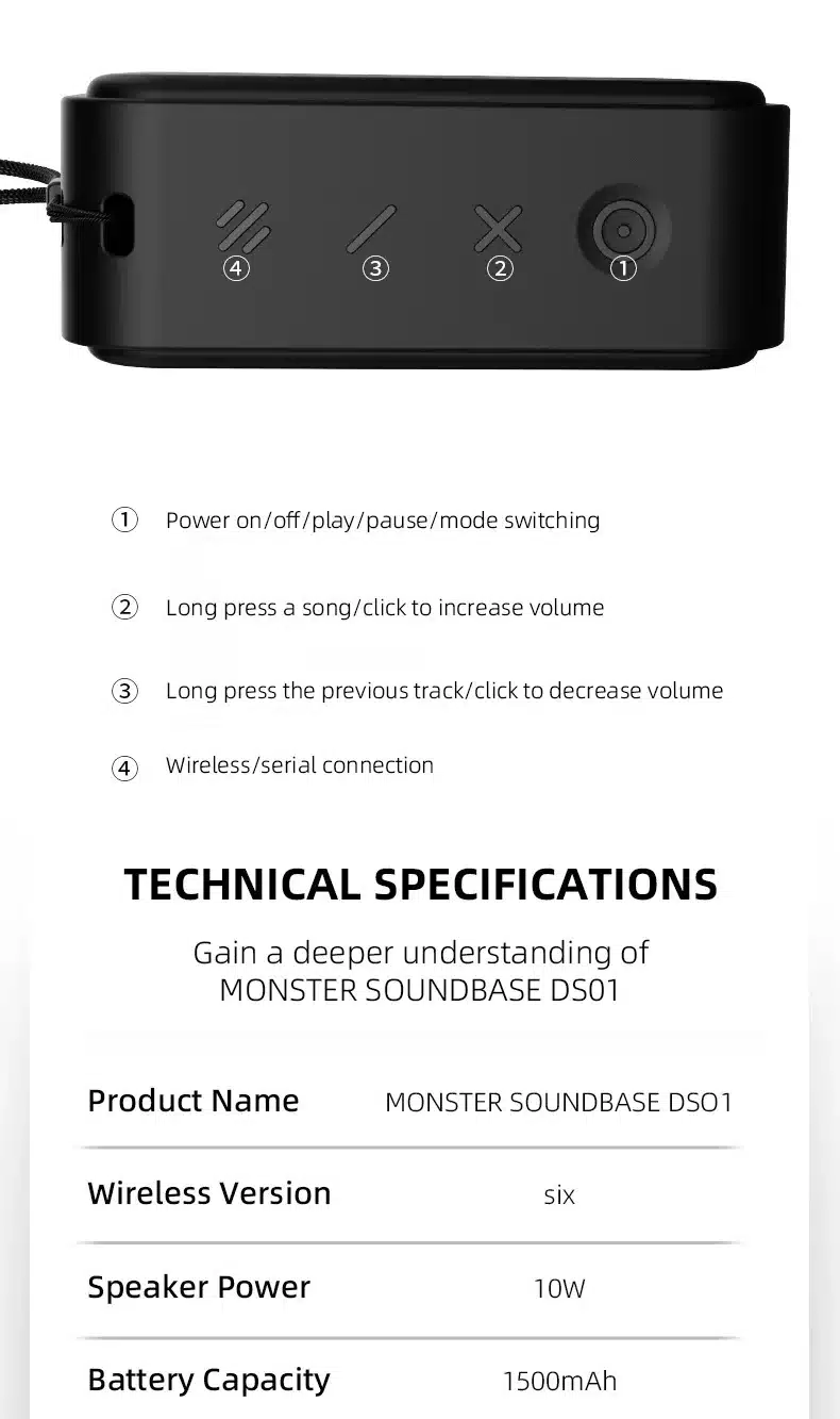 Unleash your music universe with the Monster Soundbase DS01 portable speaker. Engineered for those who refuse to compromise on sound quality or convenience, this compact powerhouse combines 10W high-power output with advanced dual DSP technology. Whether you’re outdoors, traveling, or relaxing at home, the DS01 delivers rich, balanced audio that defies its small size. With IP67 waterproof rating and multiple connectivity options, it’s the perfect companion for every adventure.