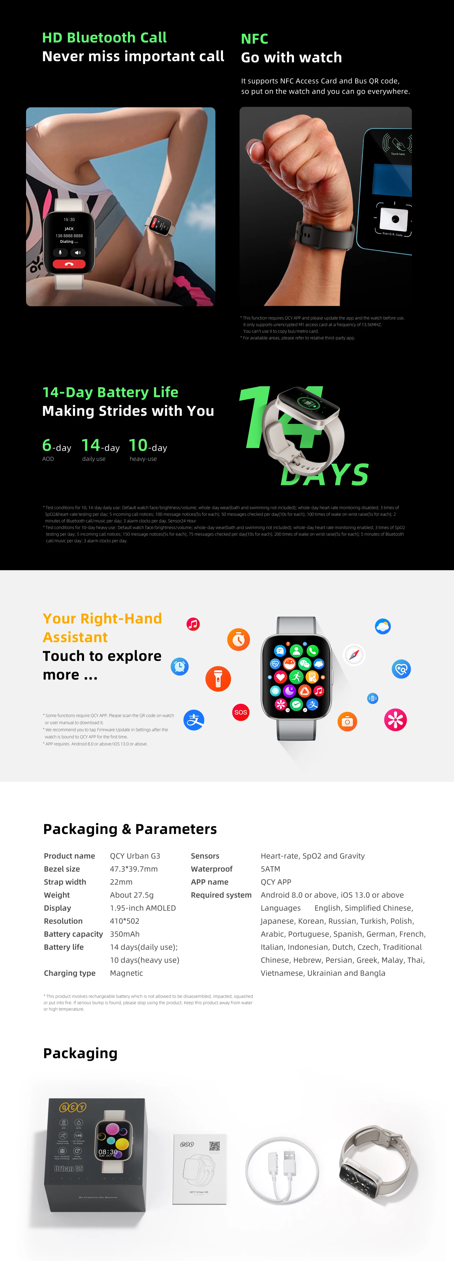 The QCY Urban GS Smart Watch offers a solid mix of features, especially for fitness and tech enthusiasts who want a stylish and affordable smartwatch. The combination of AMOLED, GPS, and NFC makes it competitive for everyday use and outdoor activities, but it might not offer the full suite of premium features you’d find in more expensive models.