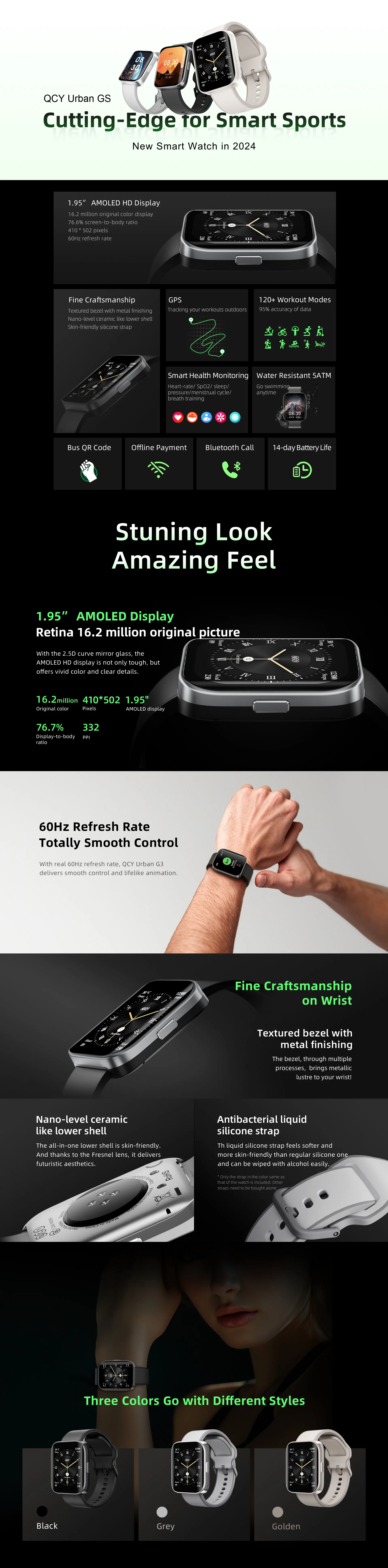 - The QCY Urban GS features an AMOLED display, which provides vibrant colors, deep blacks, and sharp contrast compared to traditional LCD screens. AMOLED screens are energy-efficient as well, especially when displaying darker images.