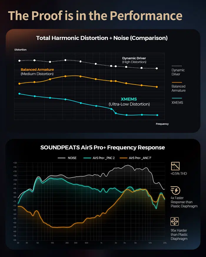 Forget the cold, harsh highs of traditional balanced armature and dynamic drivers. The SOUNDPEATS Air5 Pro+ with XMEMS technology delivers crisp, warm highs rich with natural harmonics and detail, saying goodbye to sibilance and metallic tones forever.