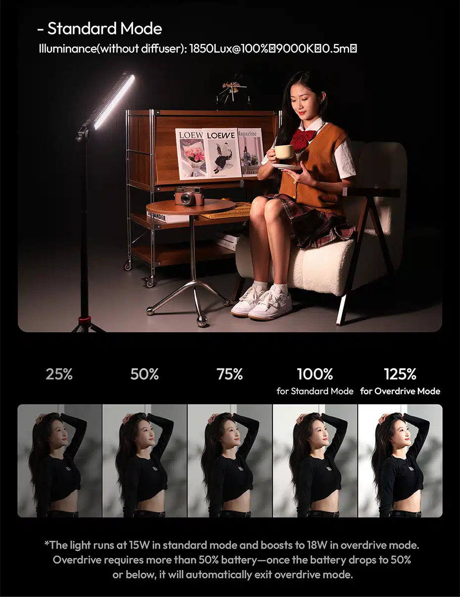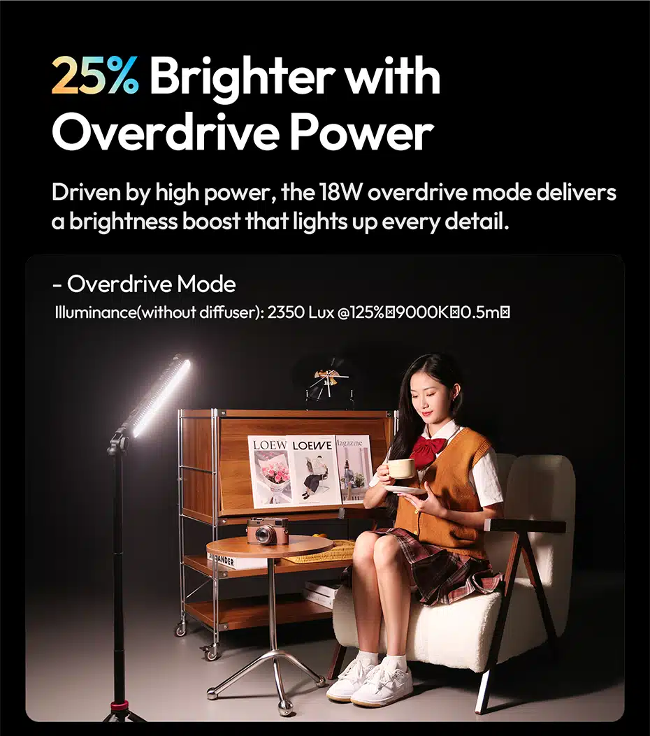 Compact Yet Powerful – 25% Brighter with Overdrive Mode: Driven by high power, the 18W overdrive mode delivers a brightness boost. Illuminance (without diffuser): 2350 Lux @125% @9000K @0.5m. Standard mode: 1850 Lux @100% @9000K @0.5m. Light up every detail.