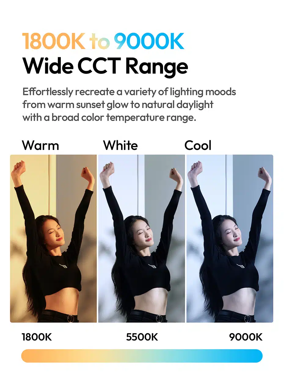 Wide CCT Range – 1800K to 9000K: Effortlessly recreate a variety of lighting moods – from warm sunset glow (1800K) to natural daylight (5500K) to cool clinical white (9000K). Broadest range in its class.