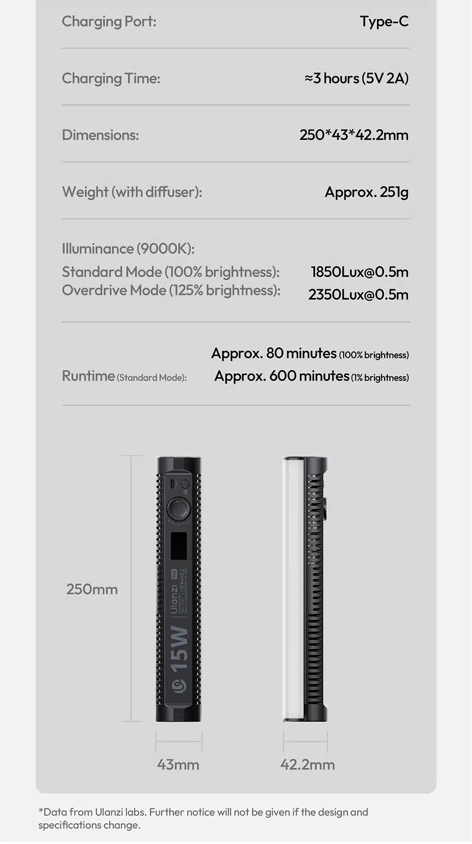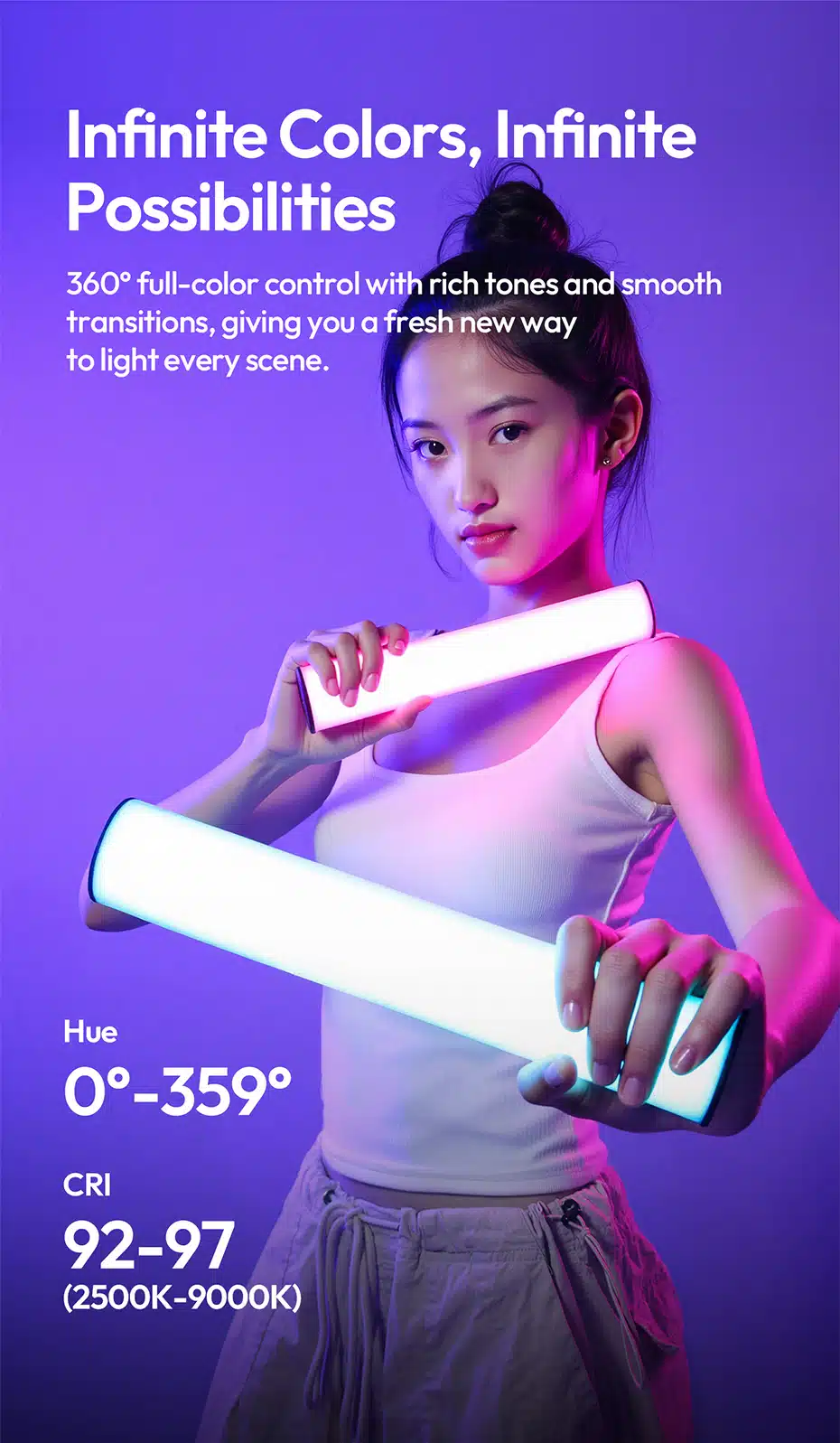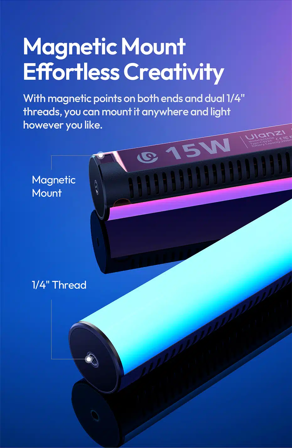 ULANZI B15RGB 15W Tube Light: 1800‑9000K | 360° RGB | 20 Effects | 18W Overdrive | Magnetic Mount | 3300mAh