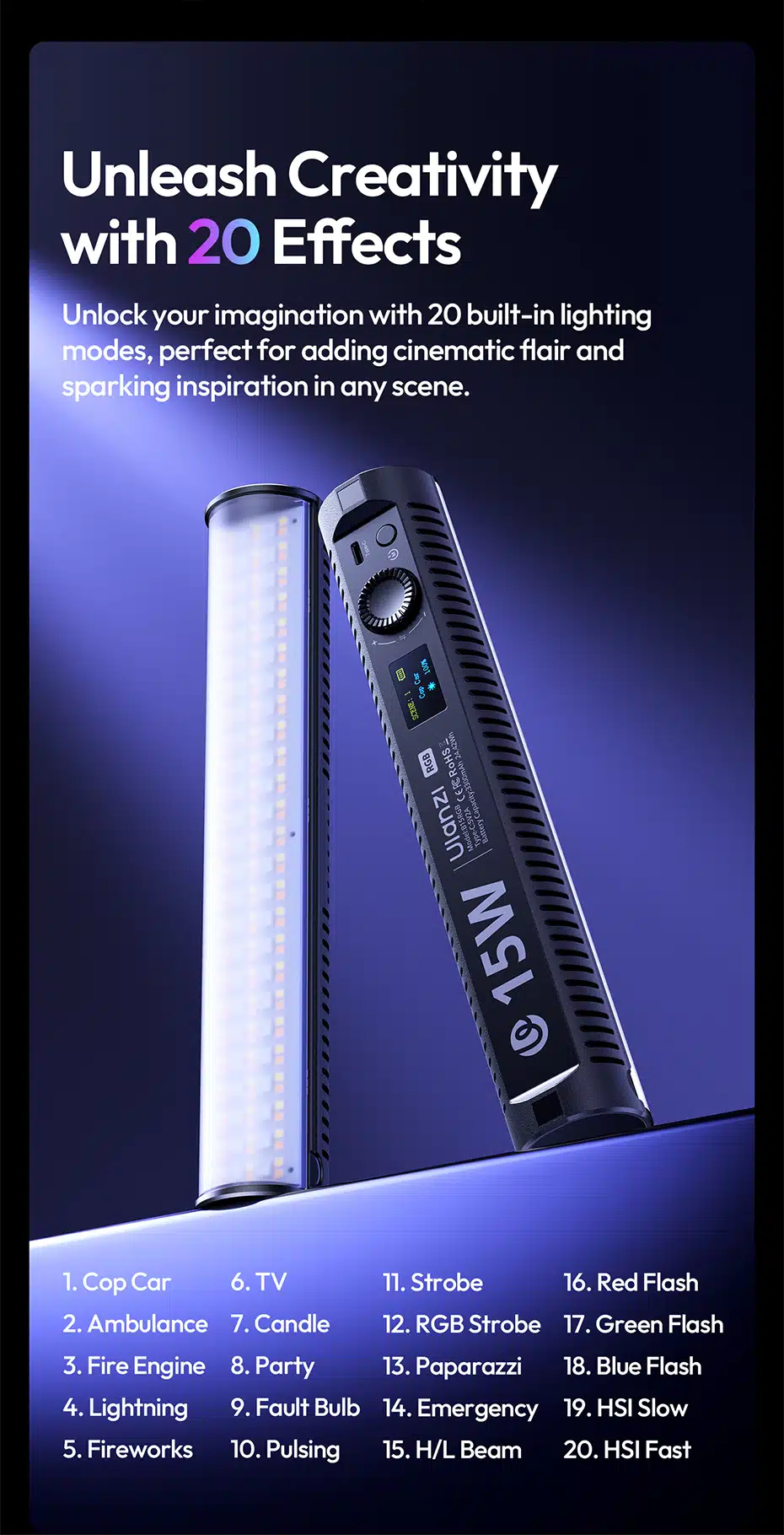 20 Built‑in Effects – Unleash Creativity: Add cinematic flair with effects including Cop Car, Ambulance, Fire Engine, Lightning, Fireworks, TV, Candle, Party, Fault Bulb, Pulsing, Strobe, RGB Strobe, Paparazzi, Emergency, H/L Beam, Red/Green/Blue Flash, HSI Slow/Fast.