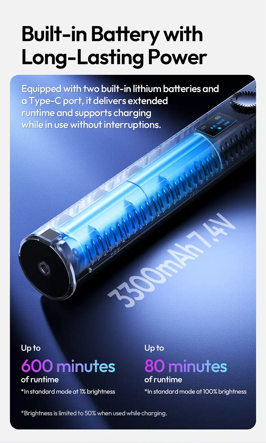 Long Battery Life – Up to 600 Minutes: Equipped with two built‑in 18650 lithium batteries (3300mAh total, 7.4V). Runtime: approx. 80 minutes at 100% brightness (standard mode), approx. 600 minutes at 1% brightness. Type‑C port supports charging while in use.
