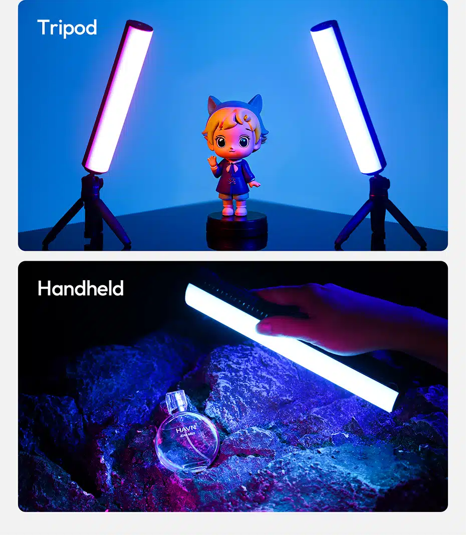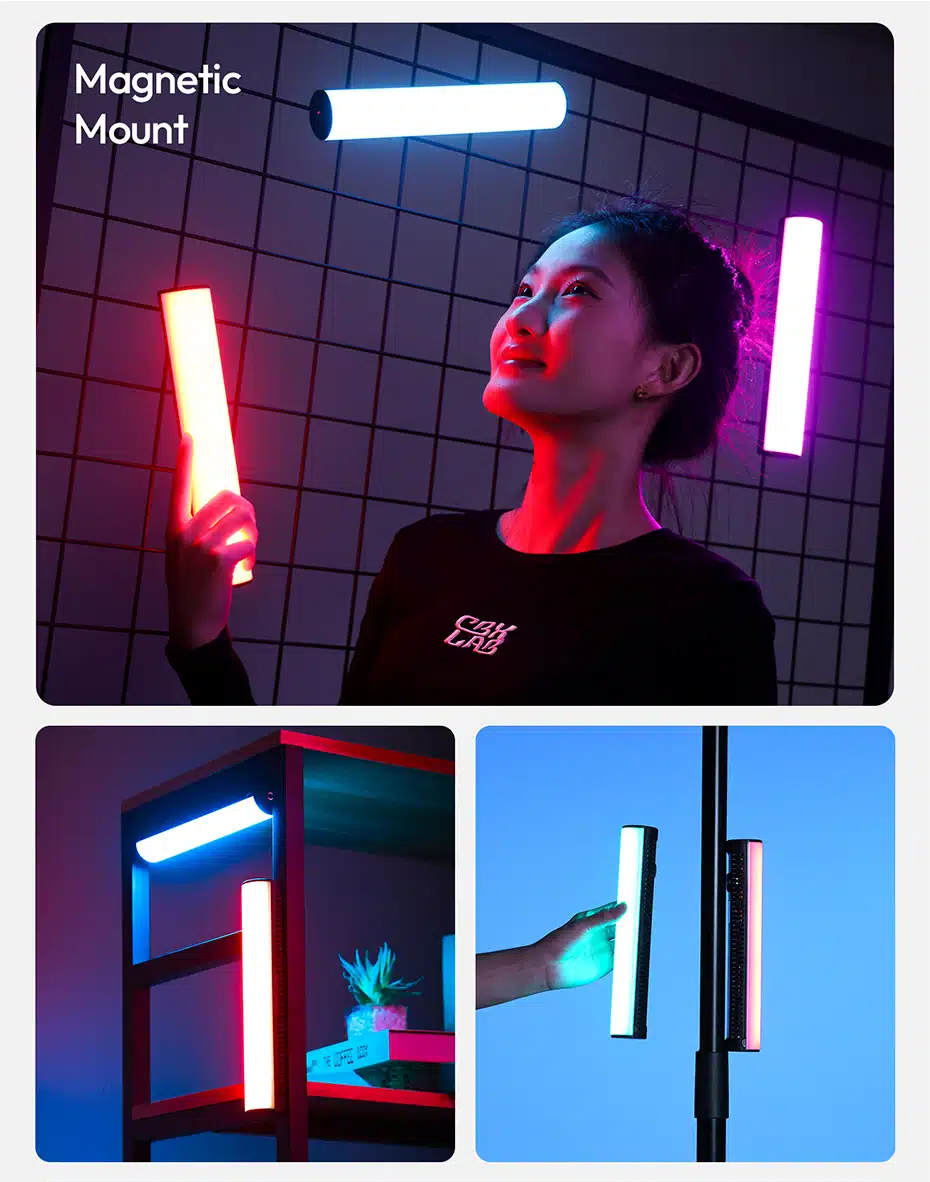 Use as handheld wand, tripod‑mounted key light, or magnetically attached fill light