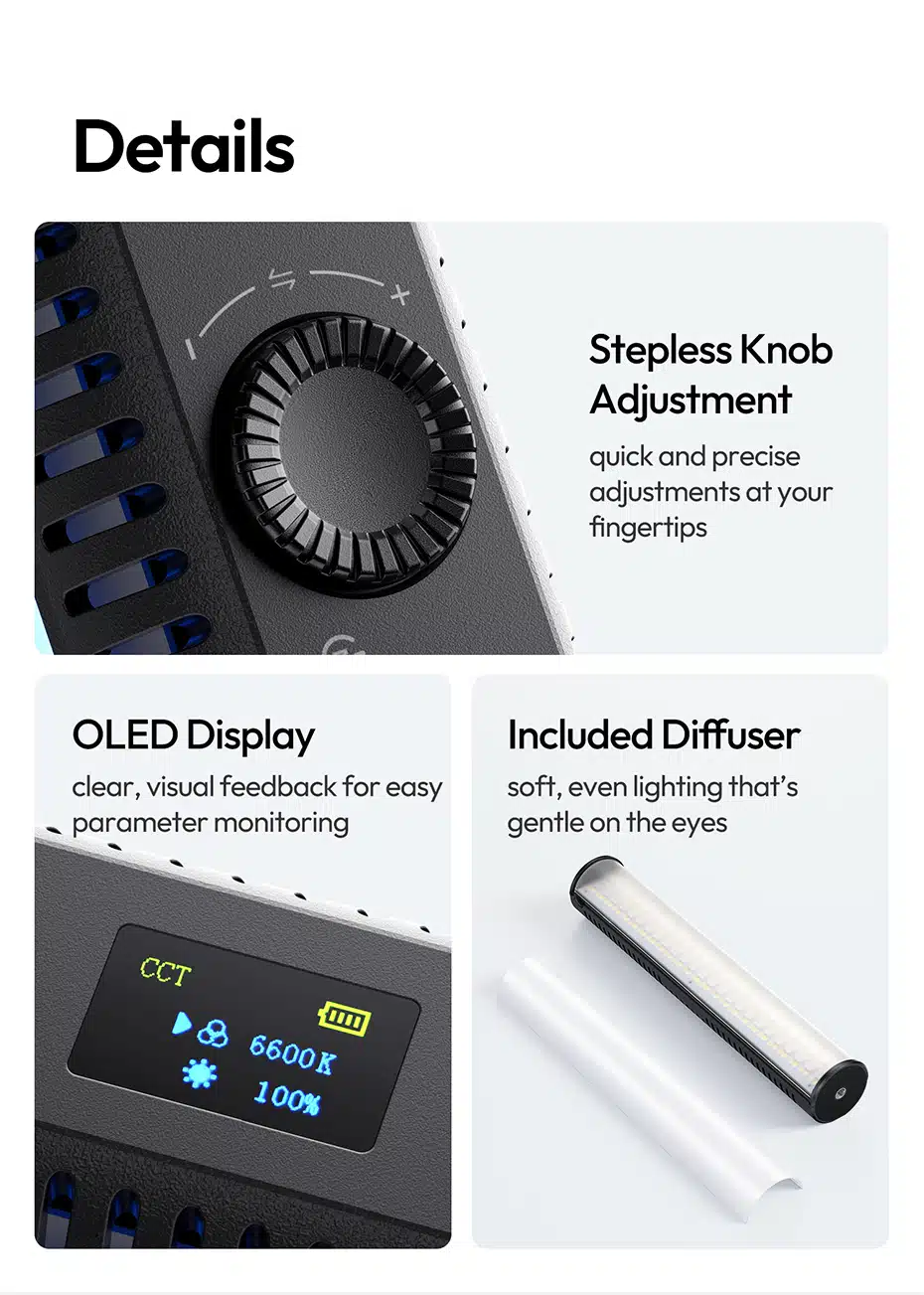 Included Diffuser – Soft, Even Lighting: Attach the diffuser for gentle, eye‑comfortable light. Perfect for portraits and interviews.