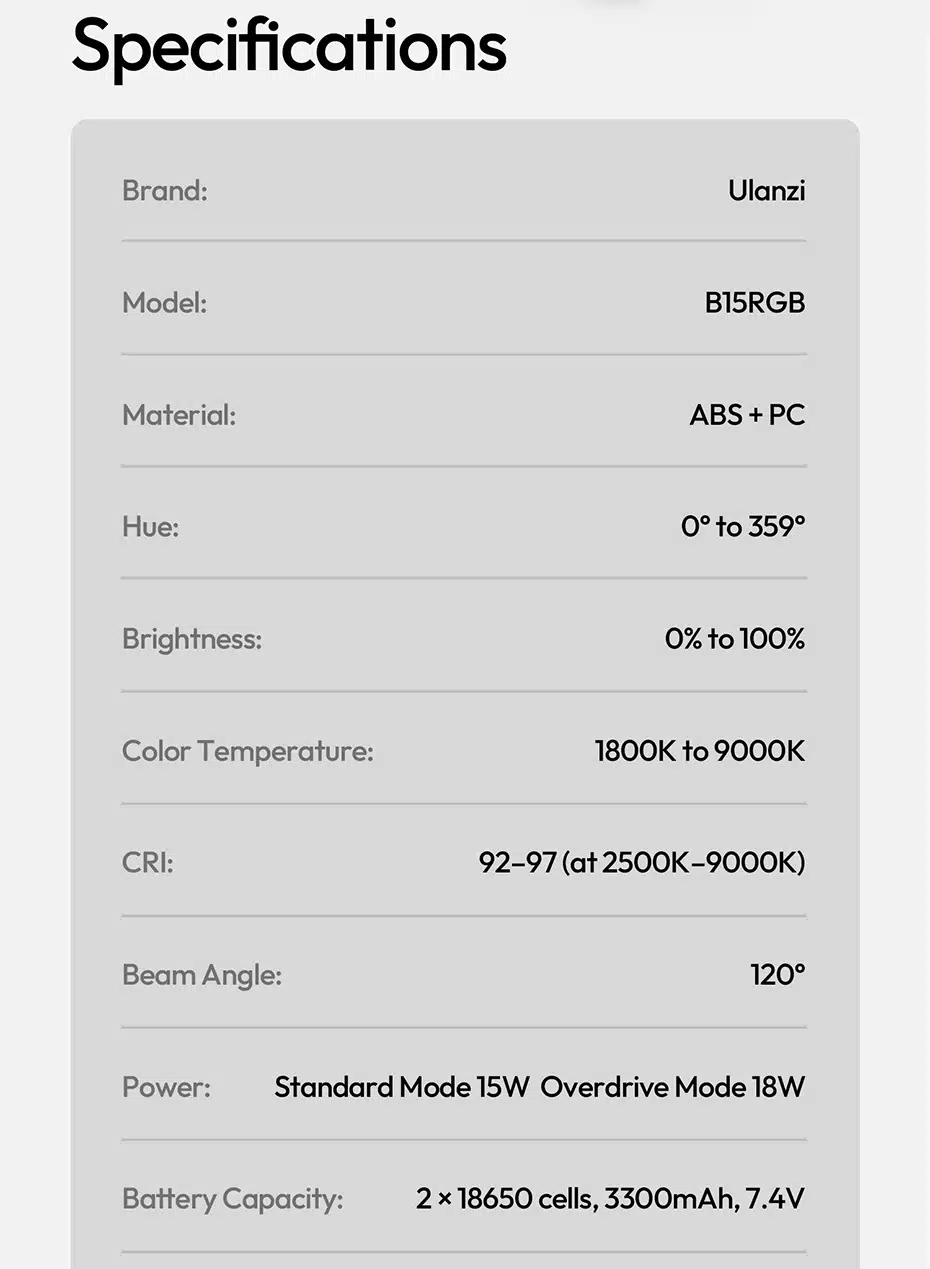 | Illuminance (Overdrive, 125%, 9000K, no diffuser) | 2350 Lux @0.5m |
