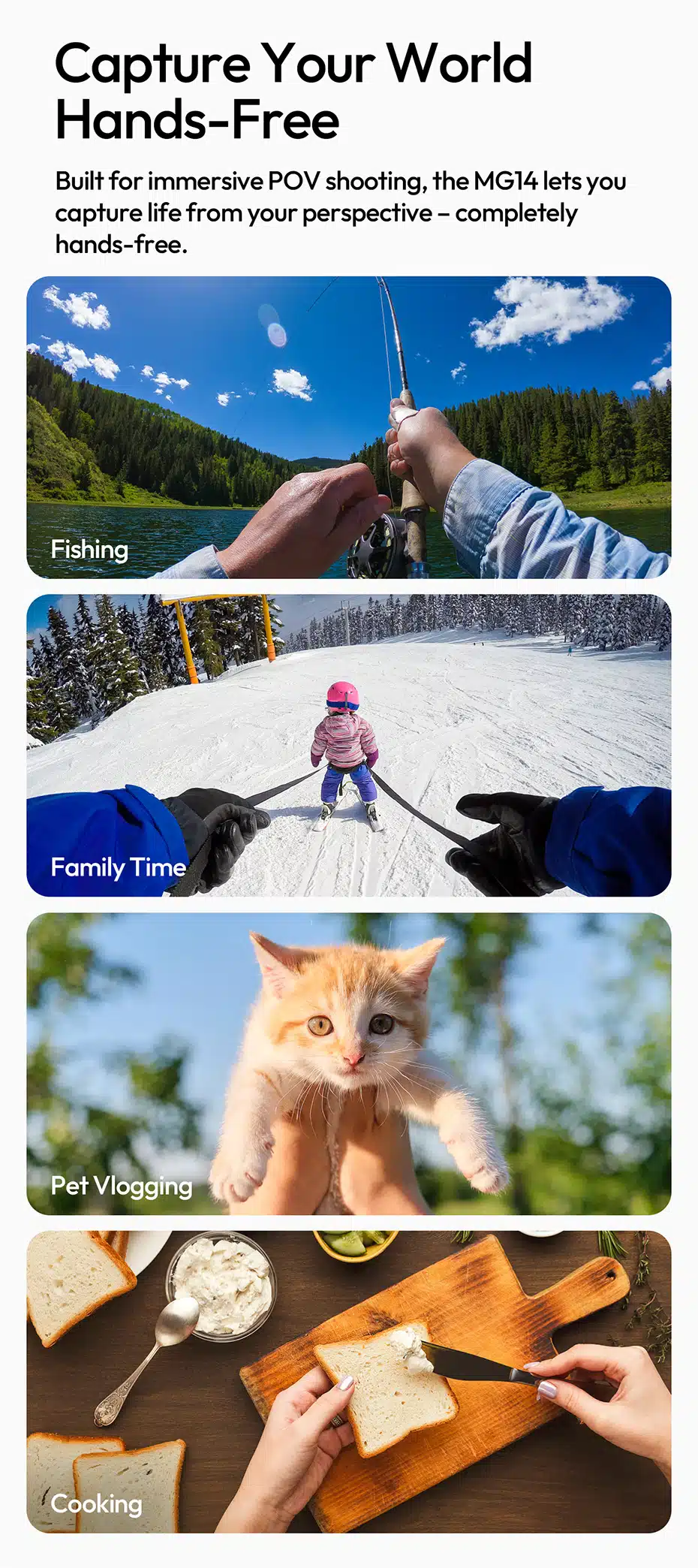 The MG14 is designed for creators who want to capture life from their own perspective without holding a camera or phone. Whether you’re: