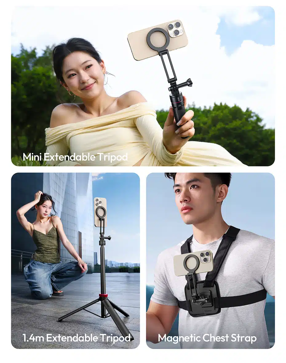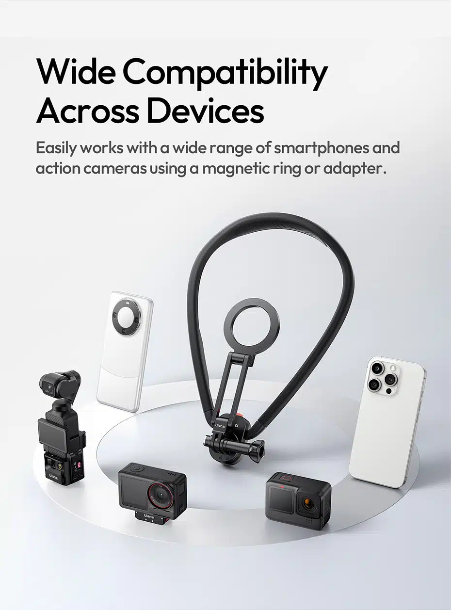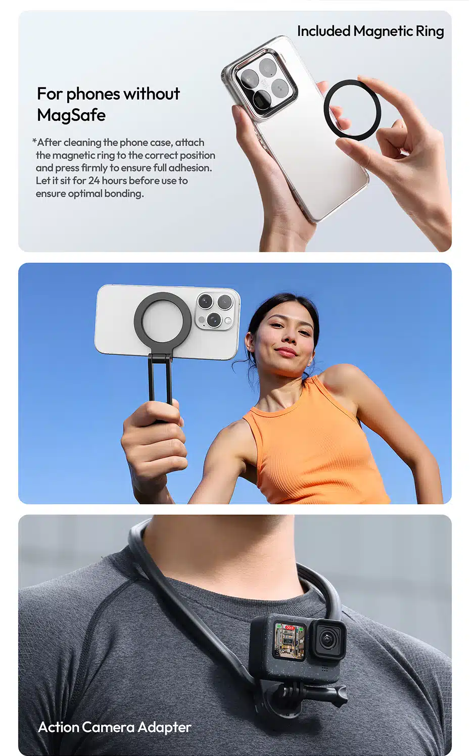 Wide Compatibility – Smartphones & Action Cameras: Works with a wide range of smartphones (MagSafe or with included magnetic ring) and action cameras (using optional action camera adapter). Universal design.