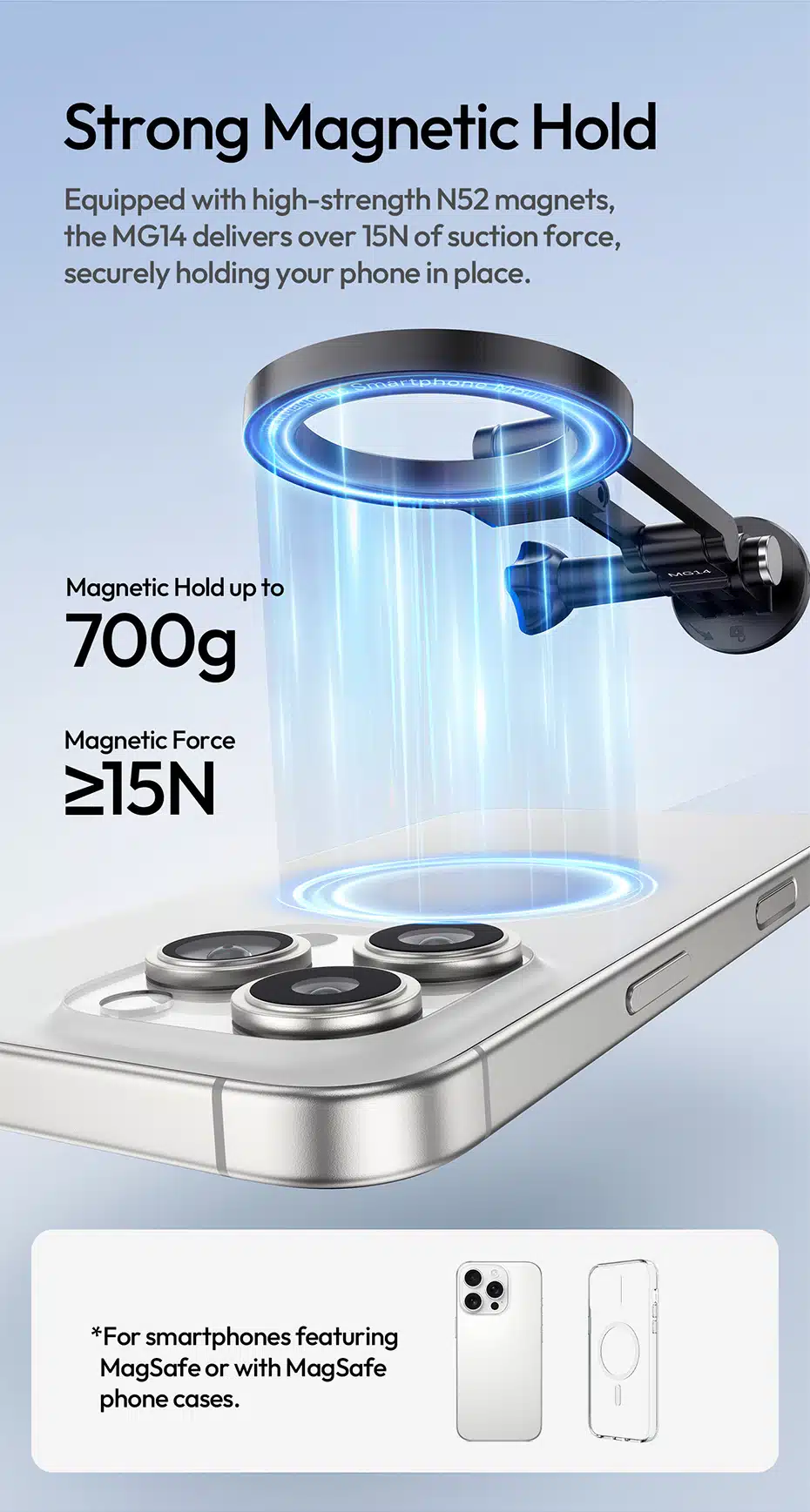 Powerful Magnetic Hold – N52 Magnets, ≥15N Force: Equipped with high‑strength N52 neodymium magnets delivering over 15N of suction force. Holds your phone securely with a magnetic load capacity of up to 700g (1.54 lb). For smartphones featuring MagSafe or with MagSafe phone cases.