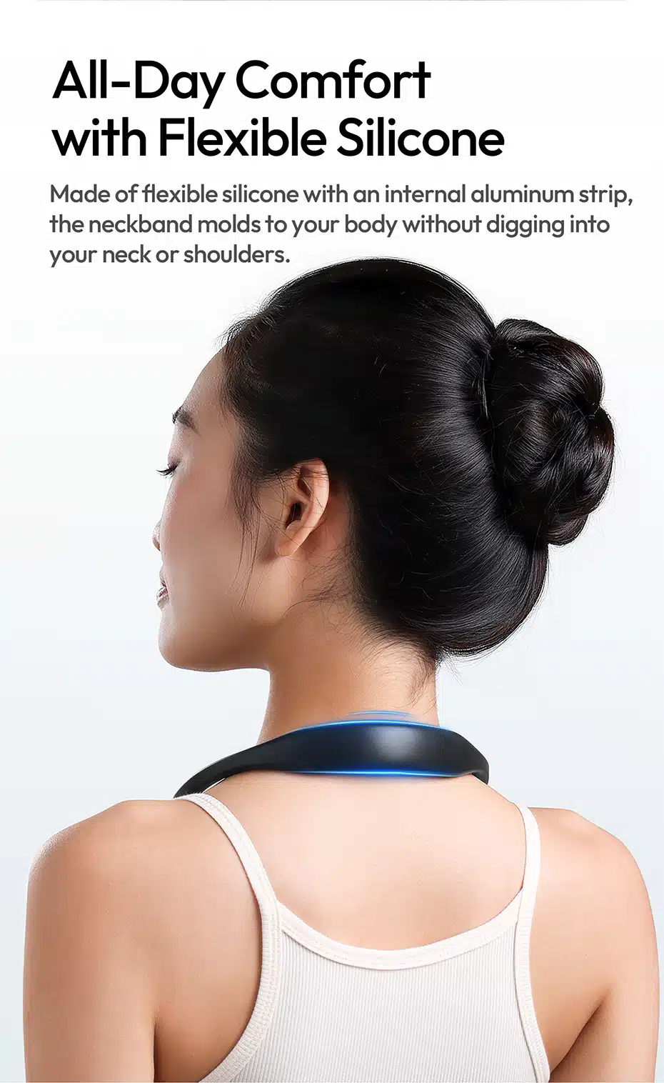 All‑Day Comfort – Flexible Silicone Neckband: Made of soft, flexible silicone with an internal aluminum strip. The neckband molds to your body without digging into your neck or shoulders. Weighs only 245g – comfortable for extended wear.