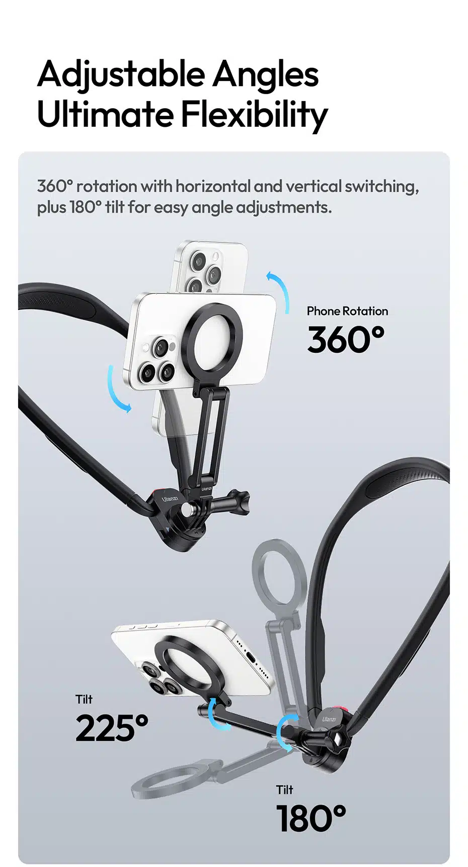 360° Rotation – Any Angle, Any Orientation: Rotate your phone 360° to capture horizontal (landscape) or vertical (portrait) shots without adjusting the neckband. Perfect for social media content, video calls, or dynamic POV angles.