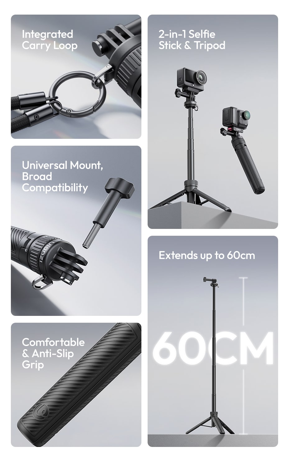 Integrated Carry Loop | Lanyard Included | Anti‑Slip Grip | 5‑Section Extension | 150g Lightweight | For GoPro, DJI Osmo Action, Insta360 & More