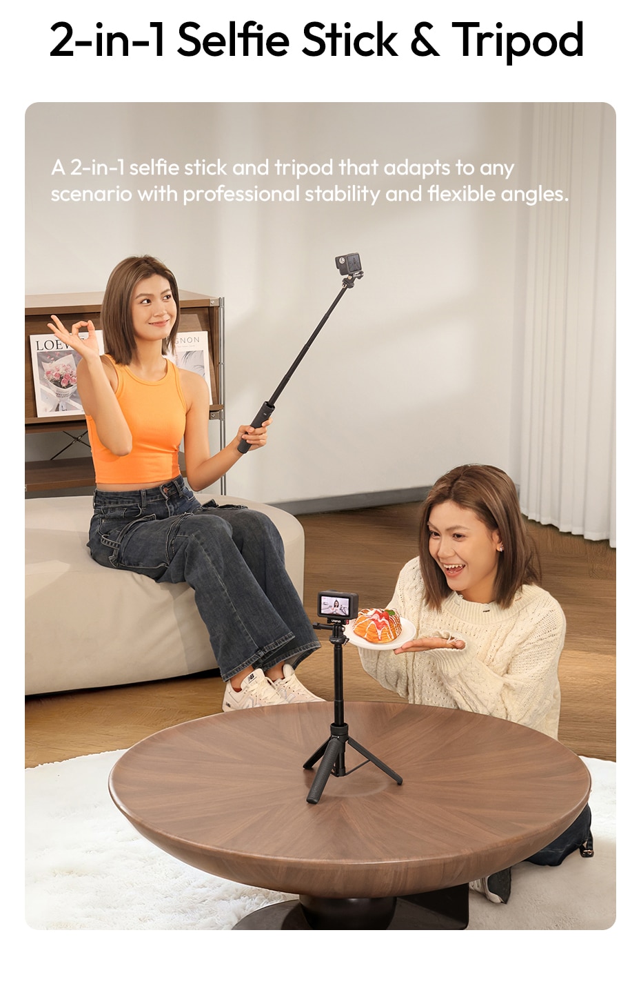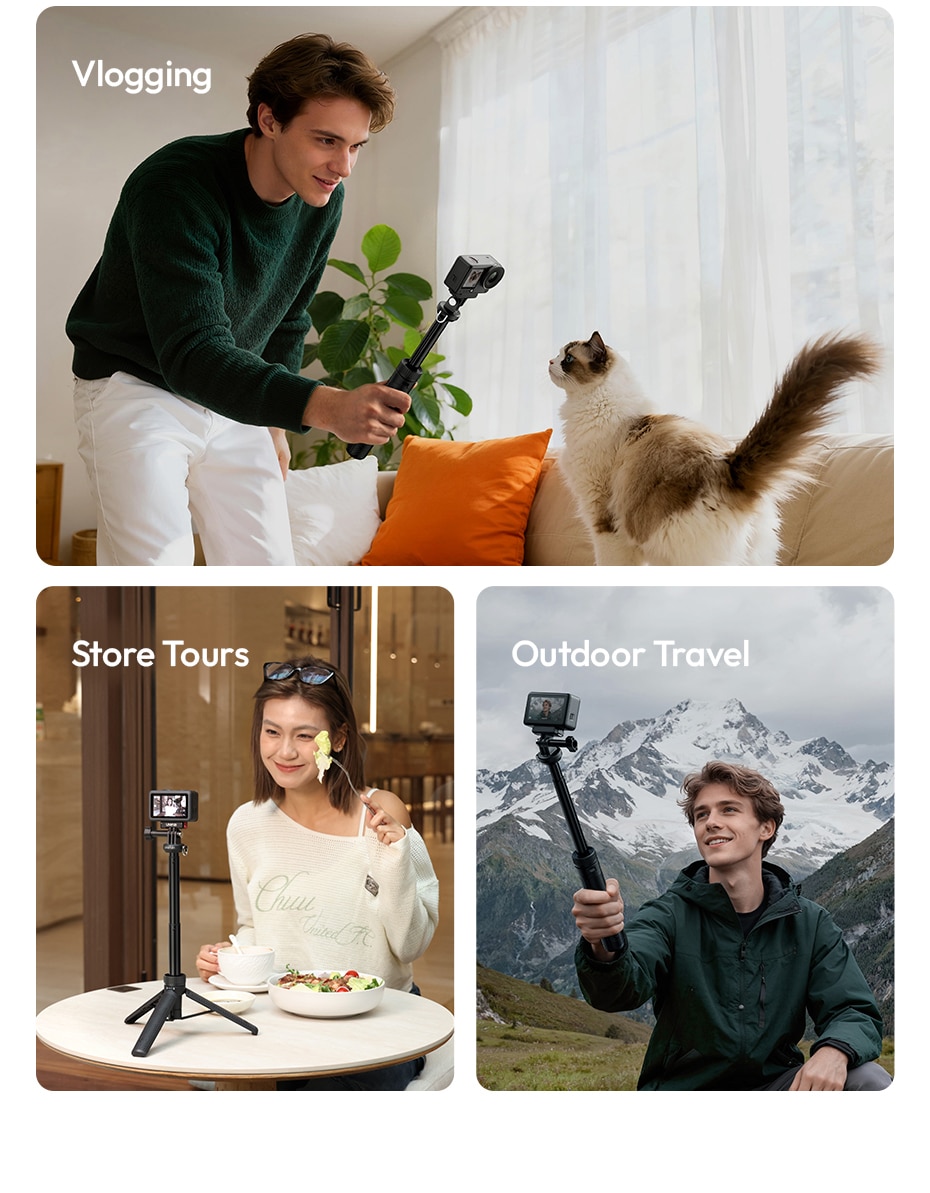 2‑in‑1 Selfie Stick & Tripod – Adapts to Any Scenario: Use as a handheld selfie stick for dynamic action shots, or deploy the integrated tripod legs for stable stationary recording. Professional stability with flexible angles.