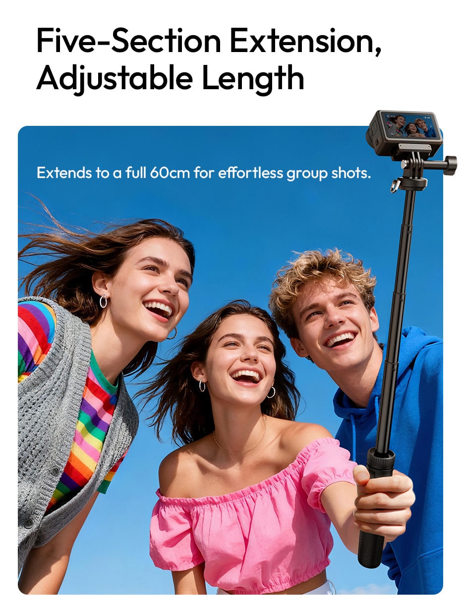 Five‑Section Extension – Adjustable Length from 19.6cm to 60cm: Extends to a full 60cm (23.6 inches) for effortless group shots, wider selfies, or unique perspectives. Collapses to just 19.6cm (7.7 inches) for compact storage.