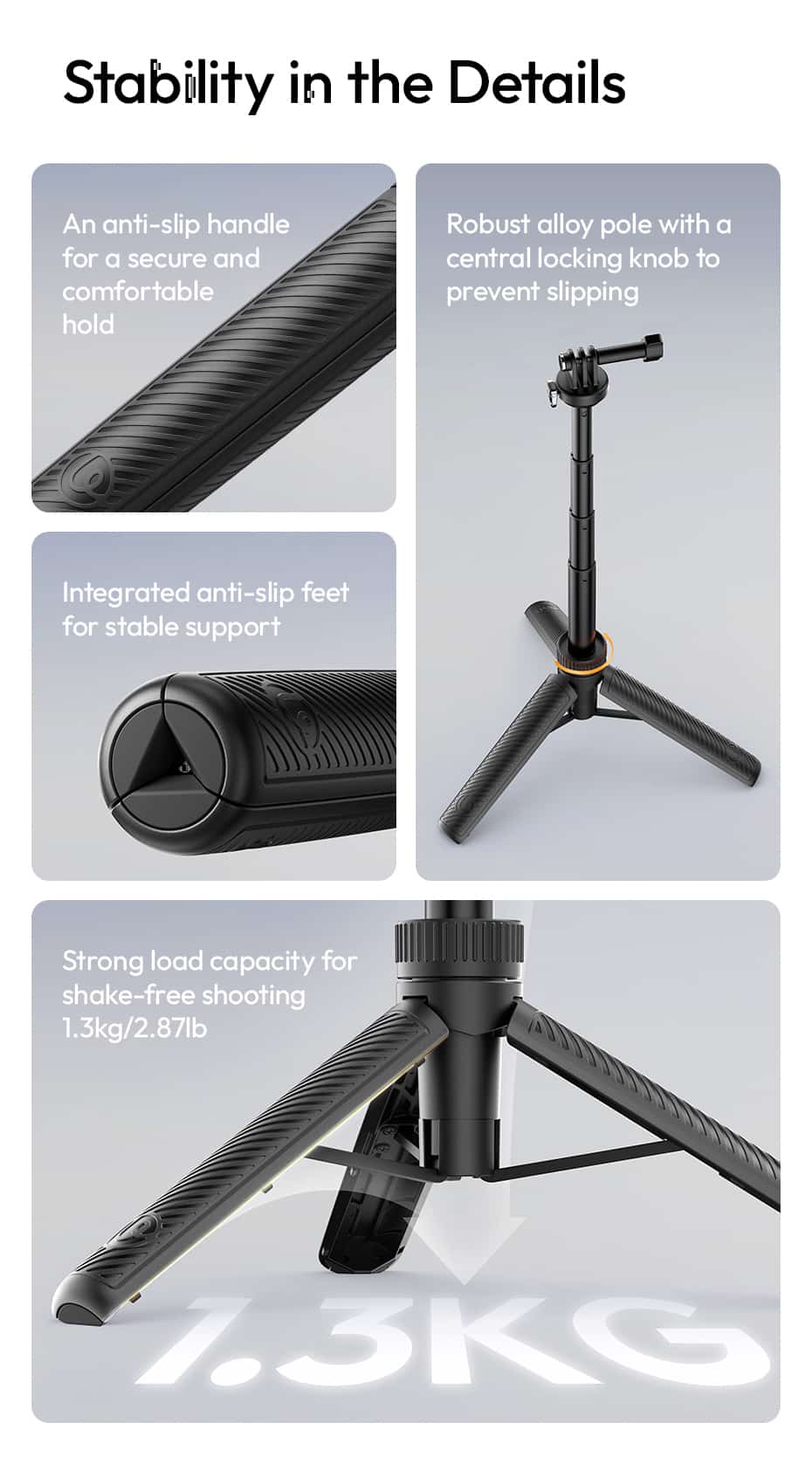 Stability in the Details: Anti‑slip handle for a secure and comfortable hold. Robust alloy pole with a central locking knob to prevent slipping. Integrated anti‑slip feet on the tripod base for stable support.