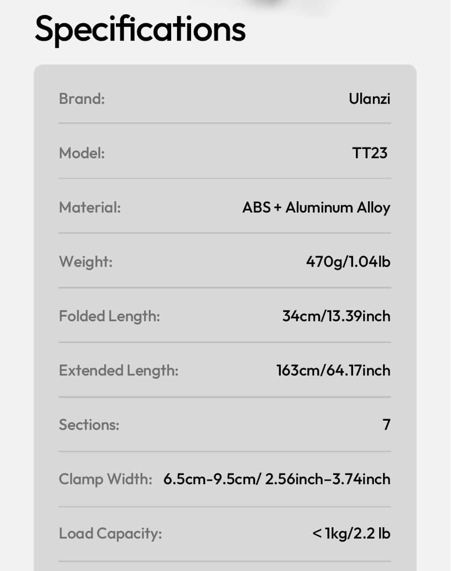Folded length of just 34cm (13.4 inches) and weight of only 470g – the TT23 slips easily into a backpack, camera bag, or even a large purse. The 7‑section telescopic pole extends smoothly to 163cm (64.2 inches), giving you the reach for full‑body selfies, crowd‑overhead shots, and versatile framing.