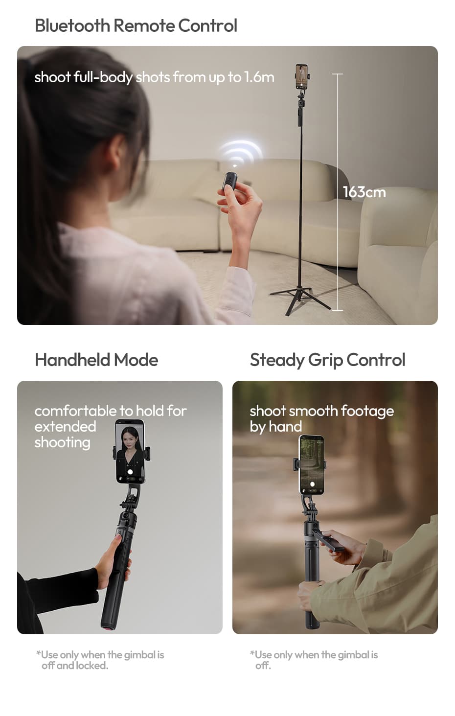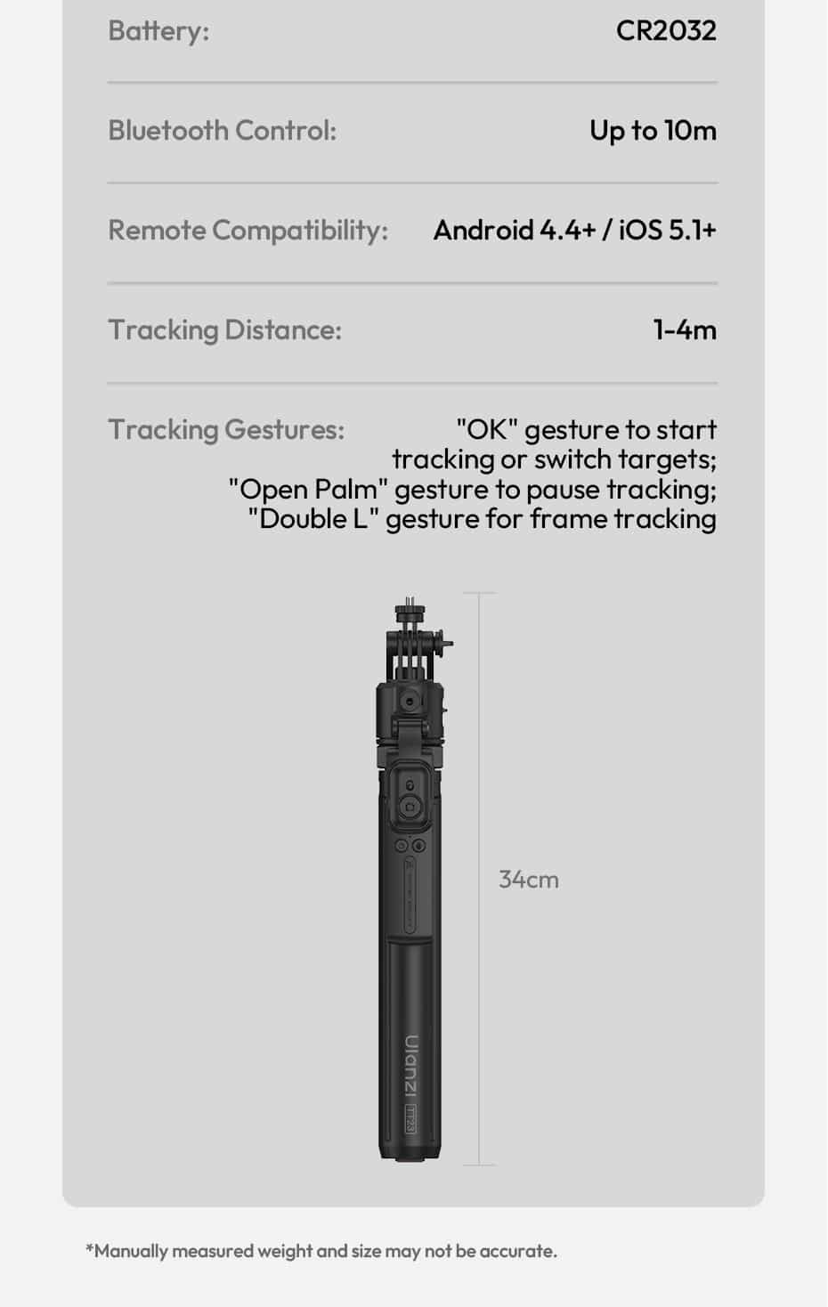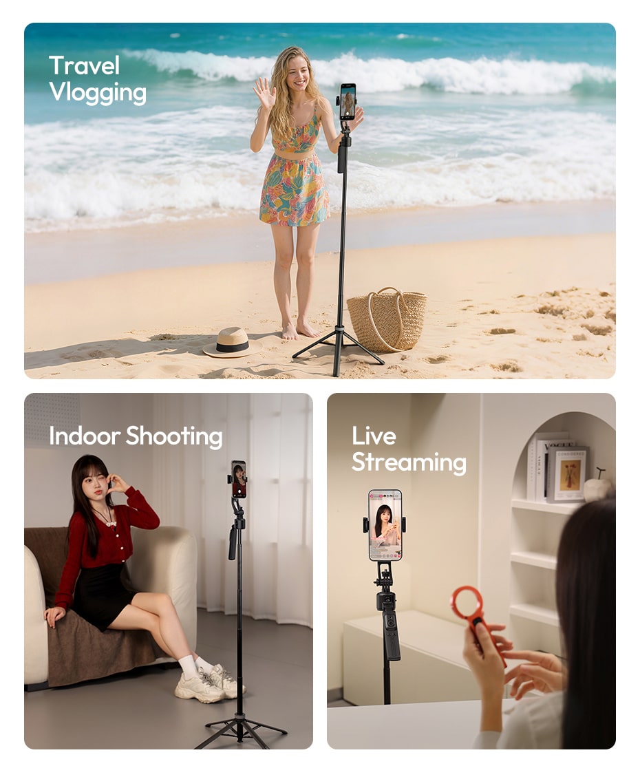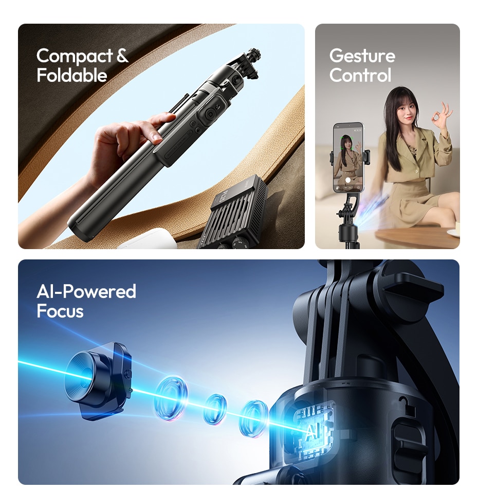 Compact & Foldable – Travel Ready: Folds down to just 34cm (13.4 inches) and weighs only 470g (1.04 lb). Extends up to 163cm (64.2 inches) in selfie stick mode – full‑body shots, group photos, and elevated angles.