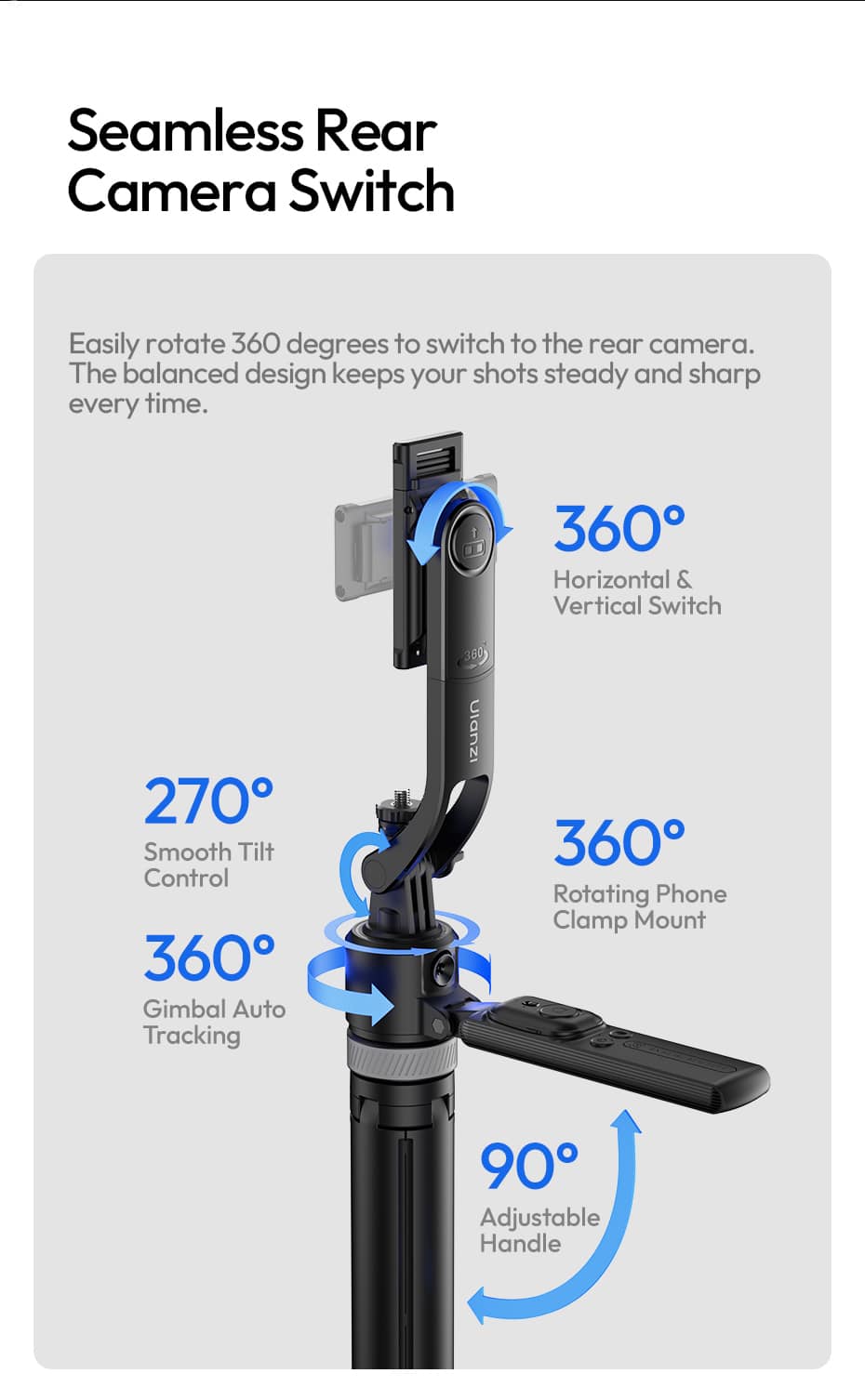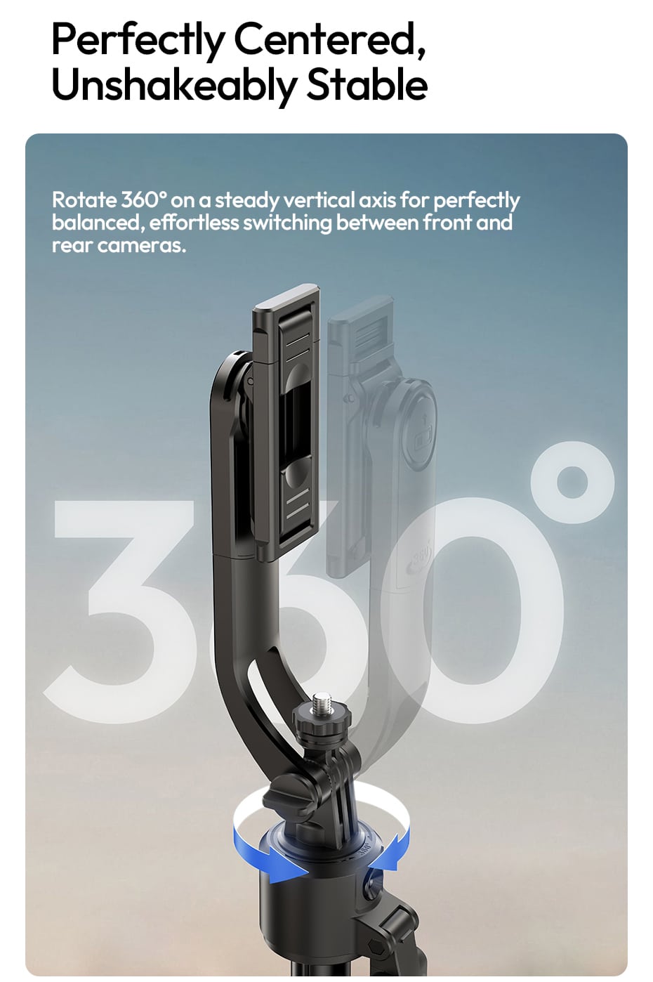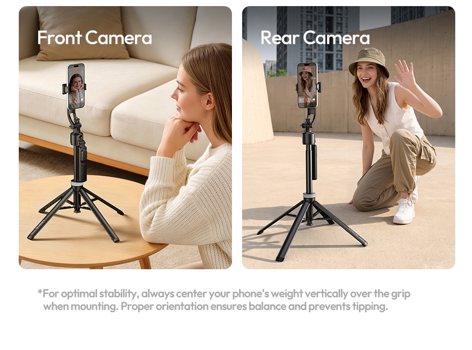 Seamless Front/Rear Camera Switch: Rotate 360° on a steady vertical axis to switch between front and rear cameras effortlessly. Perfectly balanced design prevents tipping when your phone is centered over the grip.