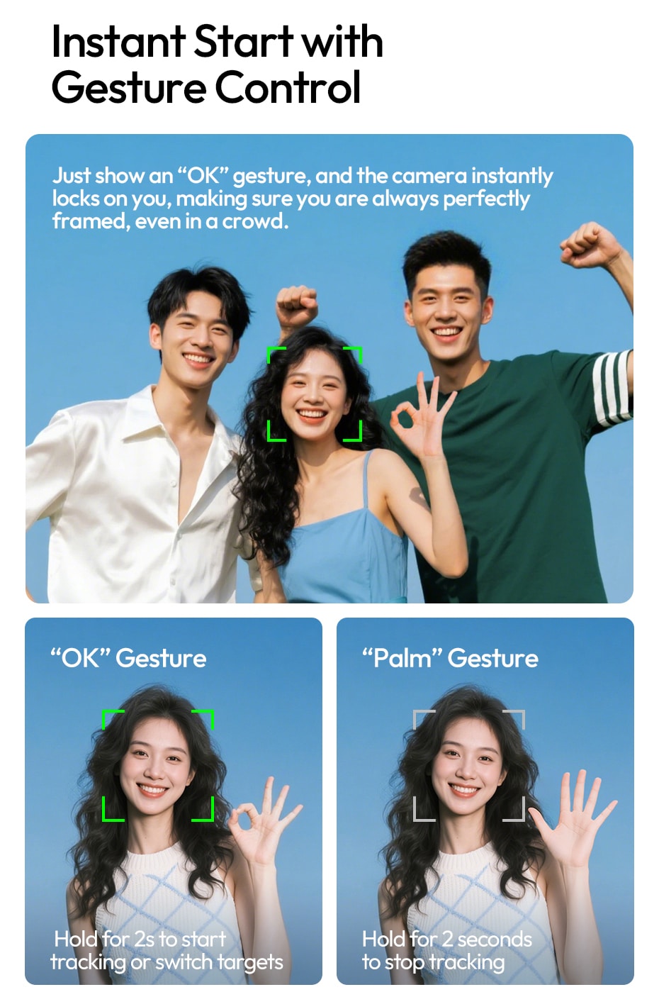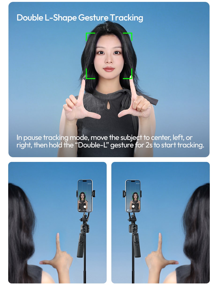 “Double‑L” Gesture (hold for 2 seconds): In pause mode, move the subject to center, left, or right, then start tracking from that position