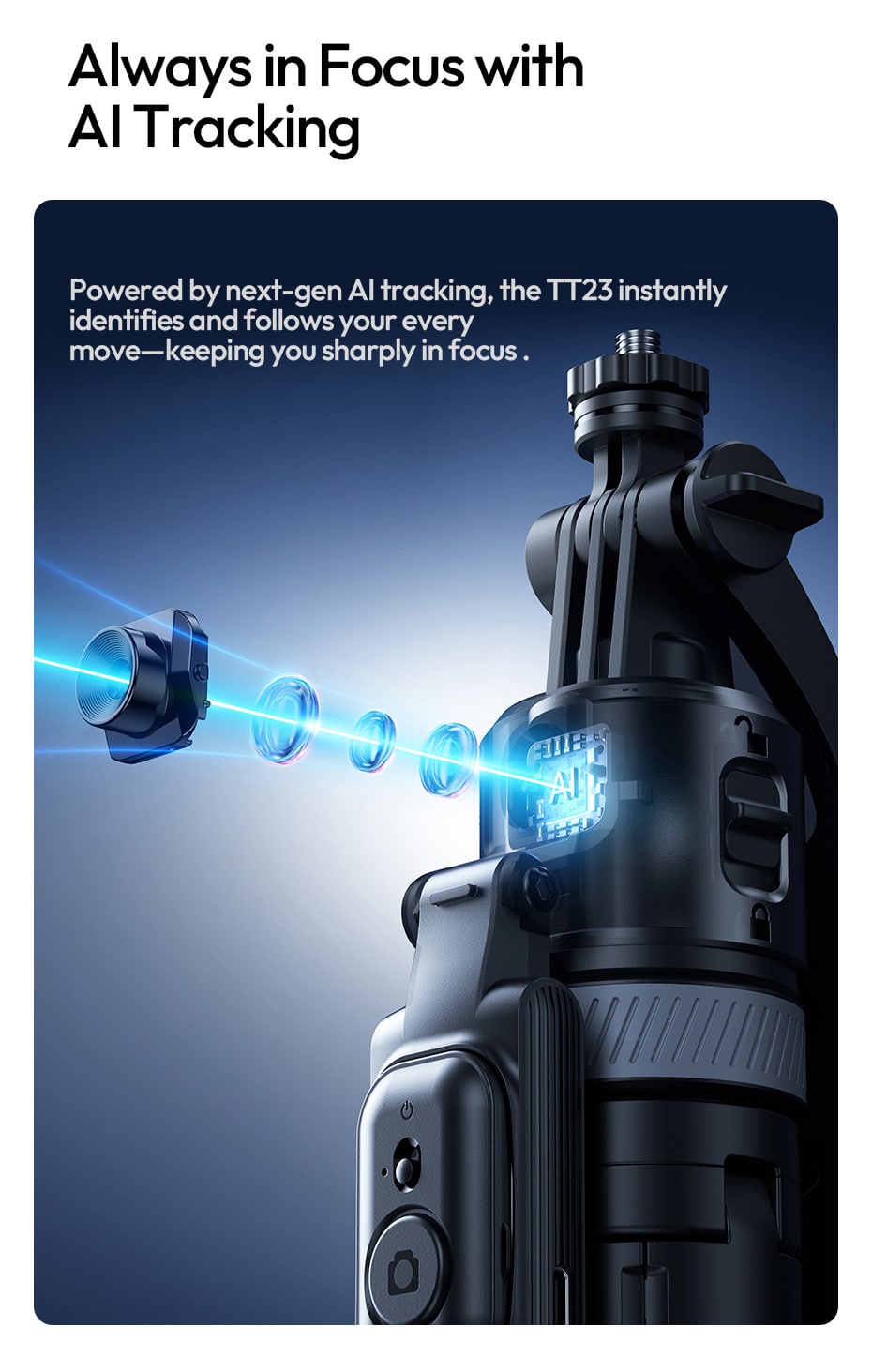 Powered by next‑generation AI, the TT23 instantly identifies you and follows your movement. But it goes further – it intelligently shifts between face, body, and back‑view tracking. Someone walks in front of you? The TT23 re‑acquires you the moment the path clears. The focus never breaks, even in a crowd.