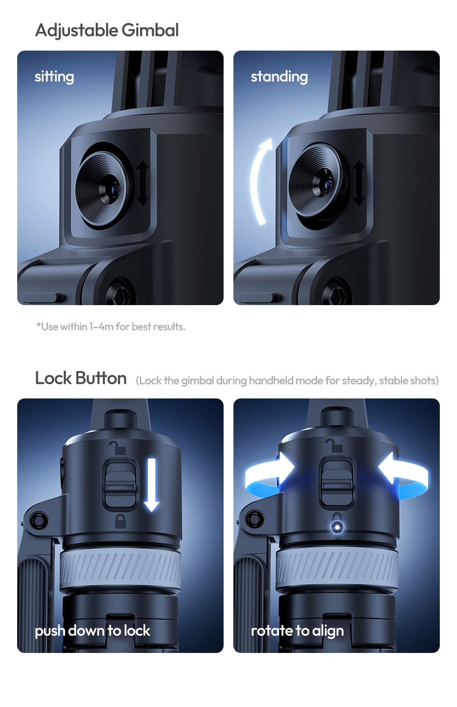 Adjustable Gimbal with Lock Button: Smooth 270° tilt control and 360° pan. Lock the gimbal during handheld mode for steady, stable shots (push down to lock, rotate to align).