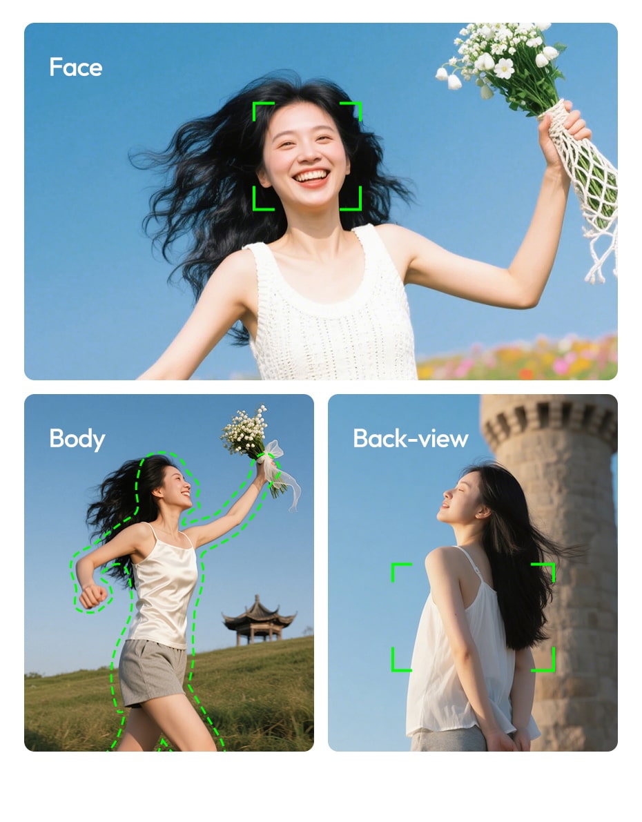 Always in Focus with AI Tracking: Next‑gen AI instantly identifies and follows your every move – keeping you sharply in focus. Works for face, body, and even back‑view tracking.