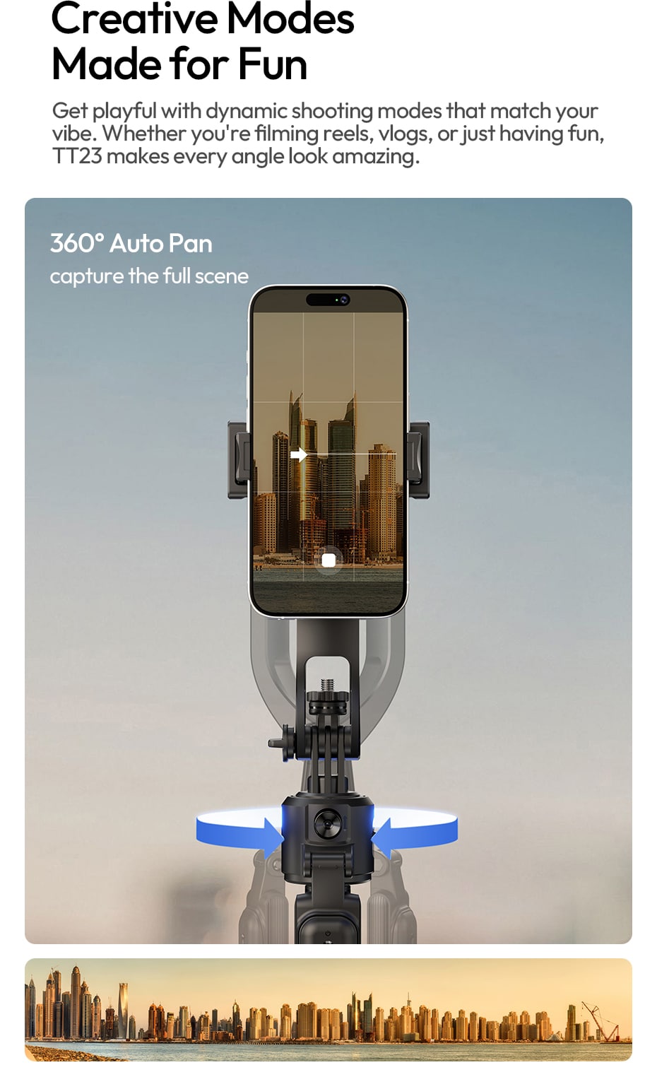 Beyond tracking, the TT23 offers a 360° auto pan mode that slowly rotates to capture the full scene. Perfect for product showcases, real estate walkthroughs, panoramic group shots, or adding cinematic movement to your vlogs.