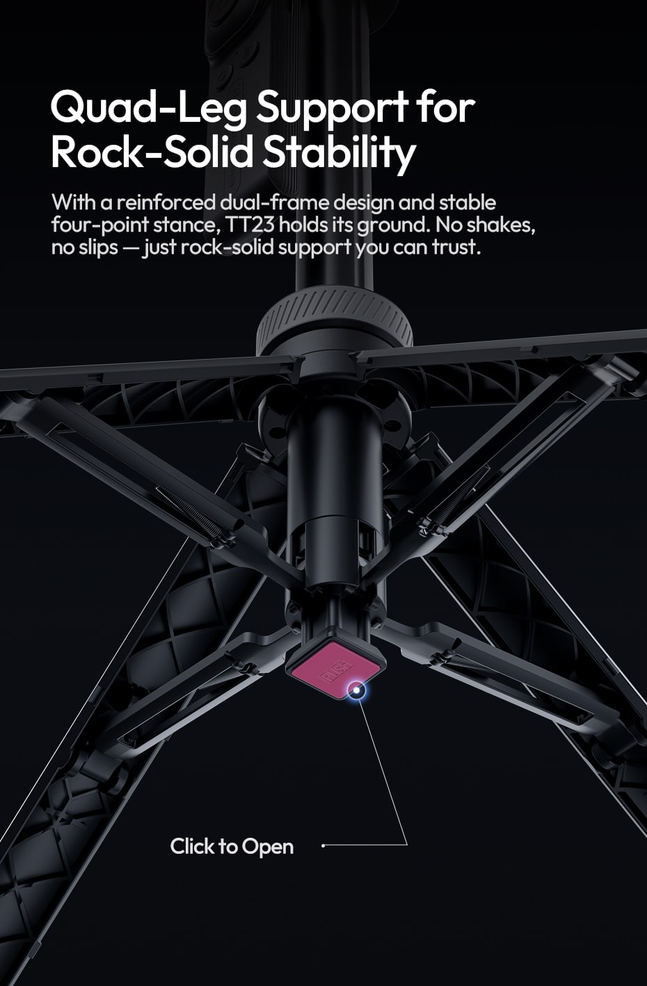 Quad‑Leg Support for Rock‑Solid Stability: Reinforced dual‑frame design with a stable four‑point stance. No shakes, no slips – just reliable support you can trust. Tap the base against the ground to auto‑deploy the legs.